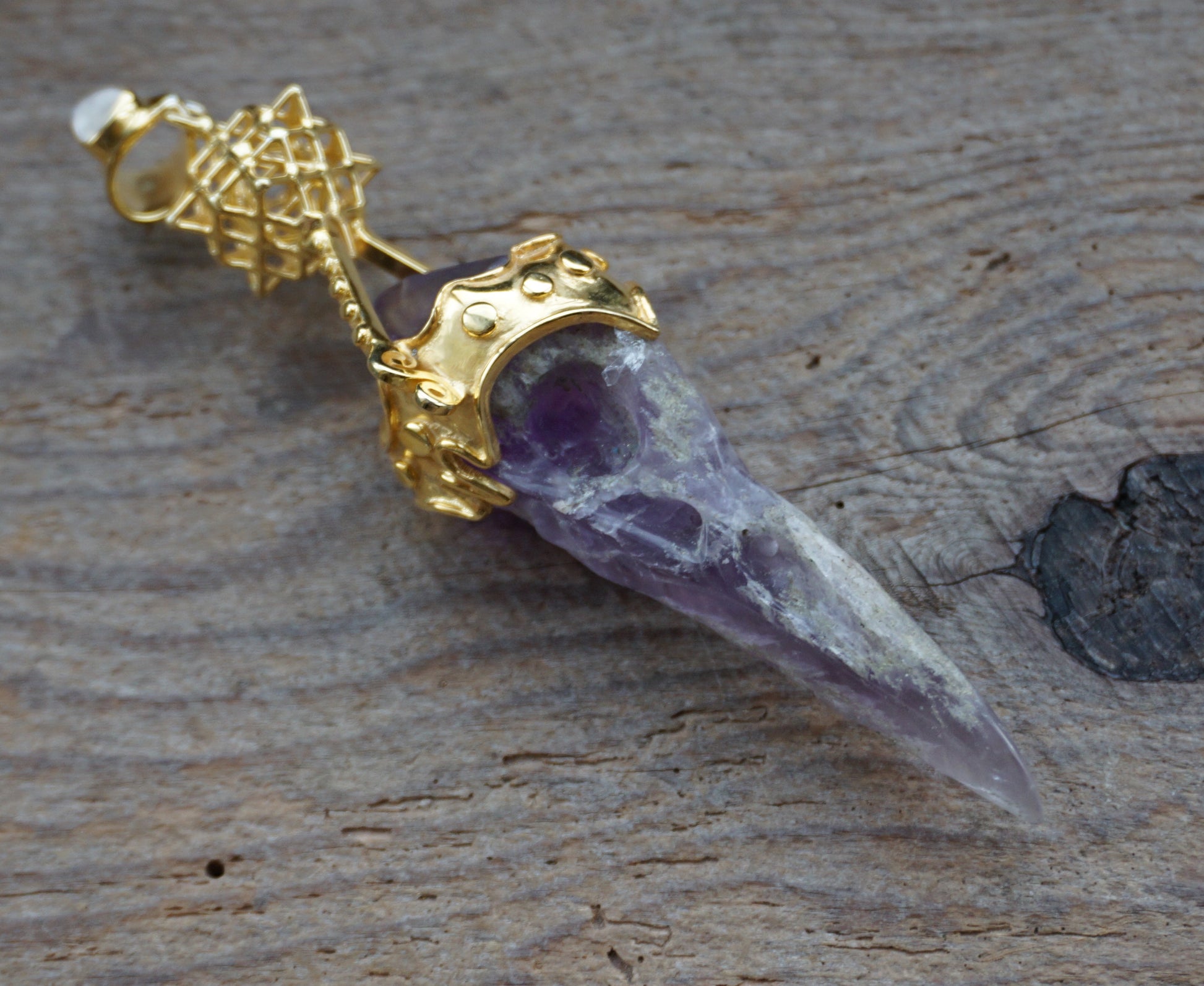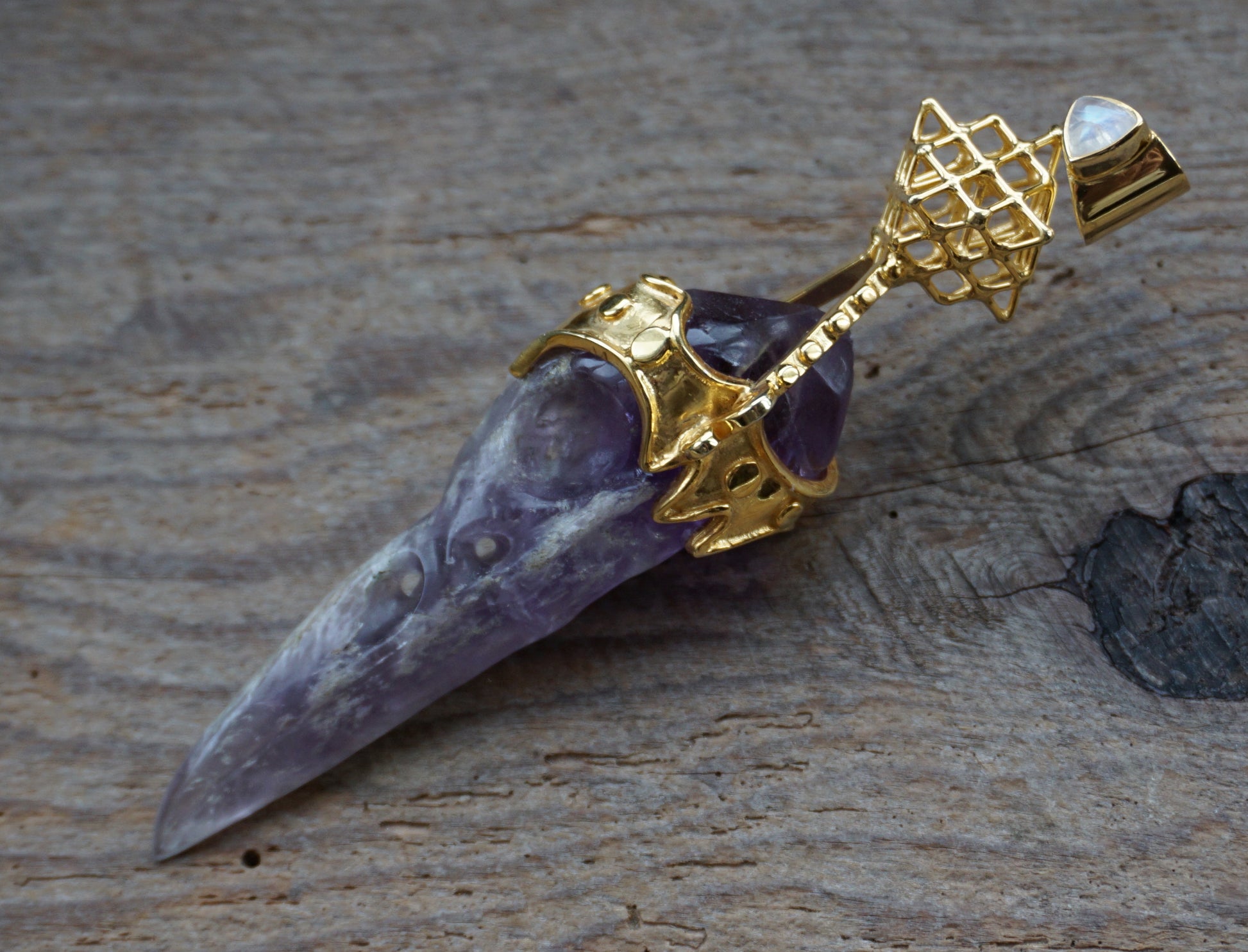 Ref.PD0505 - Gold plated on silver pendant with Tantric Terra Prana geometry, amethyst carved raven, and moonstone gemstones.