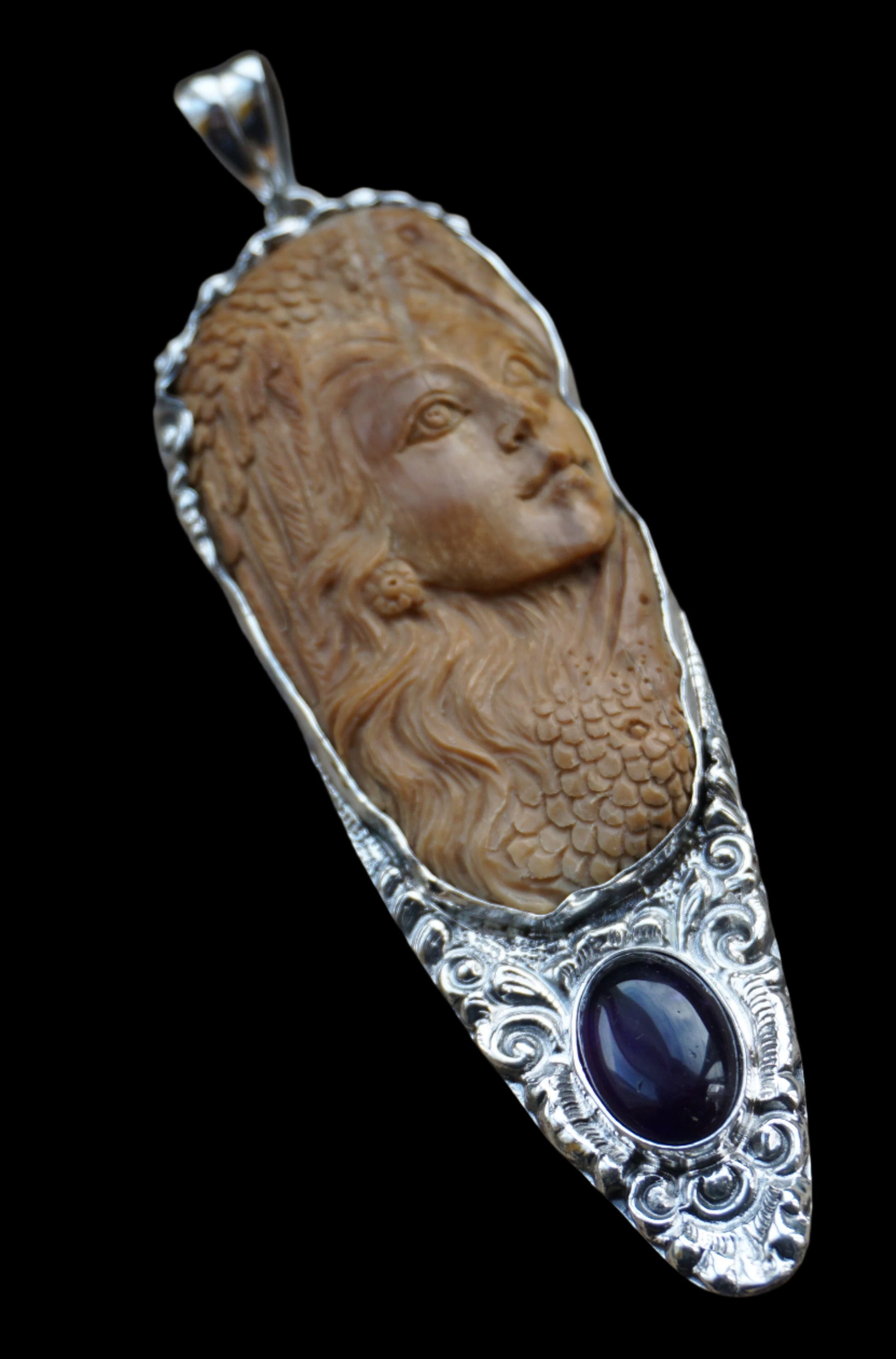 Ref.PD0530 - Repoussé silver with carved woman w/ raven motif, and amethyst gem