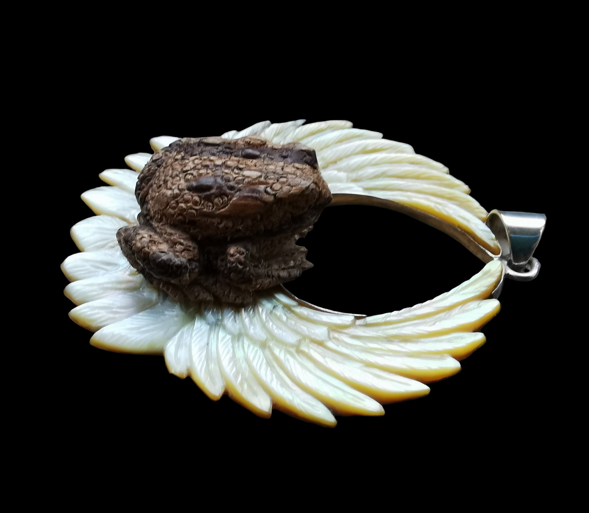 Ref.PD0596 - Silver pendant with wood carved toad, and mother of pearl carved wings.