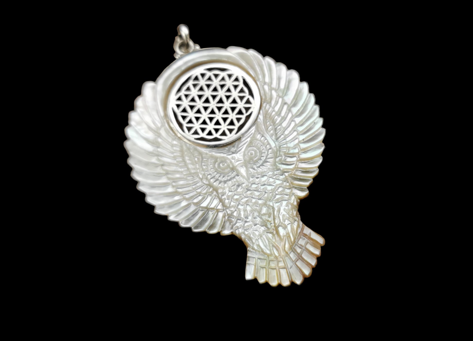 Ref.PD0597 - Mother of pearl carved owl pendant with Creation Mandala, aka Flower of Life, geometry in silver.