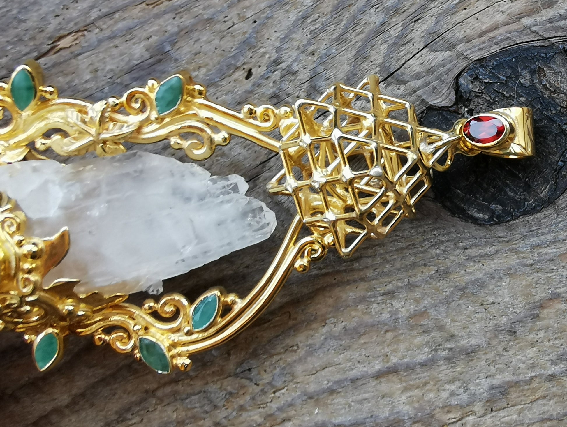 Ref.PD0625 - Gold plated on silver pendant with Tantric Terra Prana geometry, laser quartz crystal, emerald, and garnet gemstones.