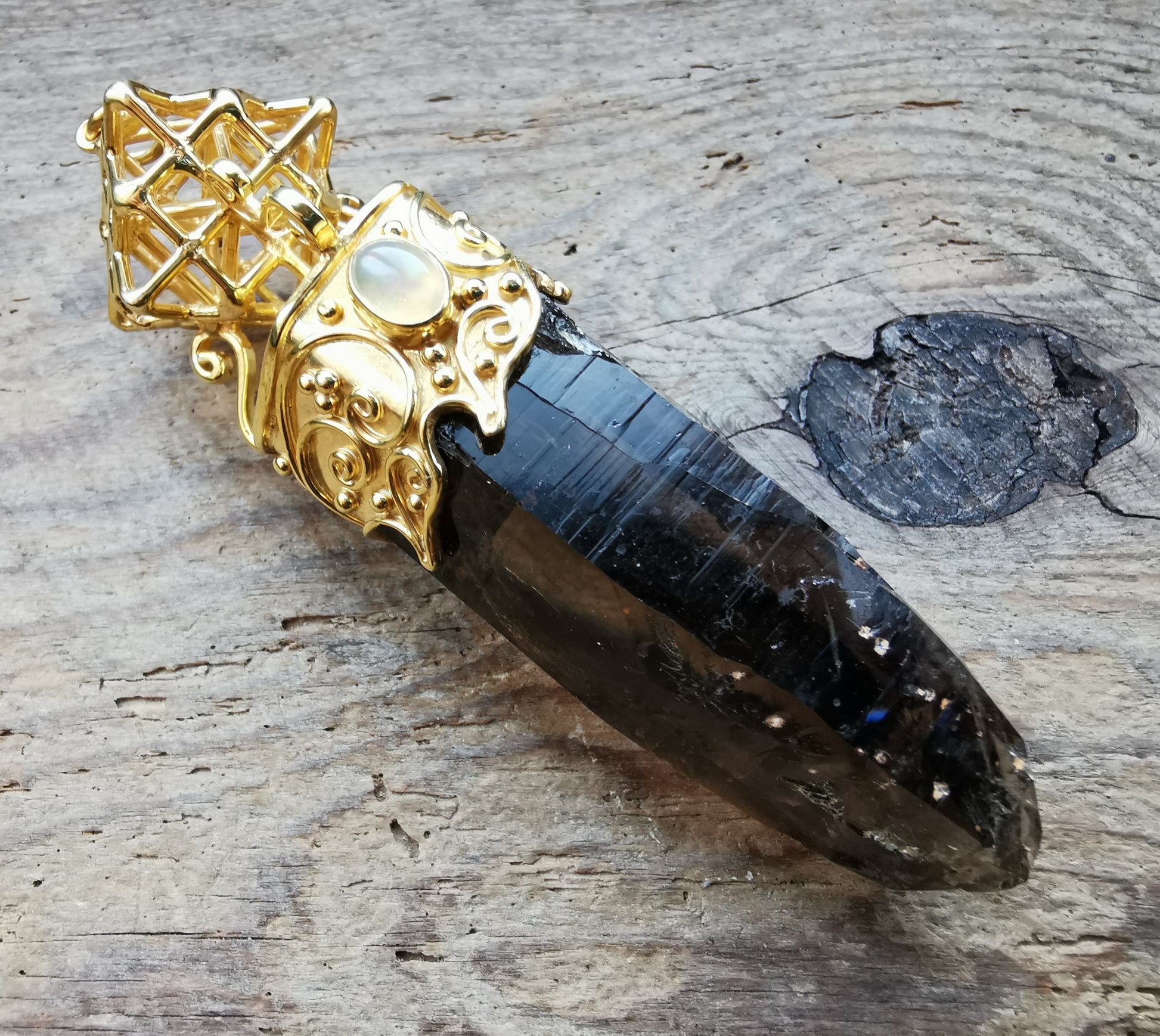 Ref.PD0694 - Gold plated on silver pendant with Tantric Terra Prana geometry, smokey quartz crystal, and opal gemstone.