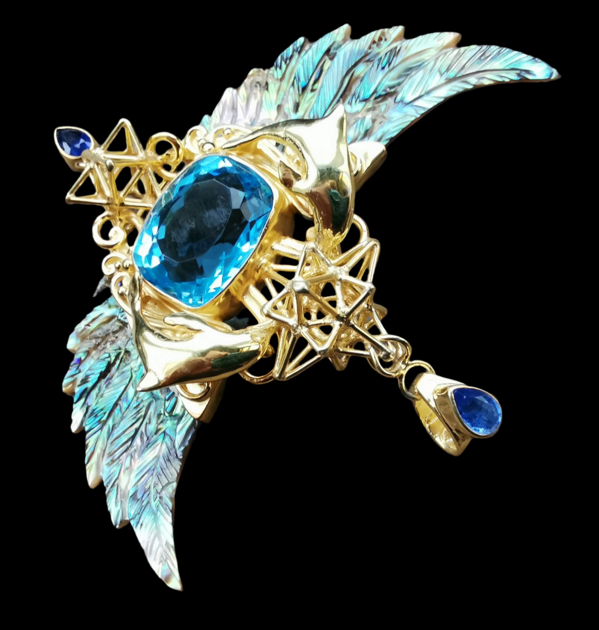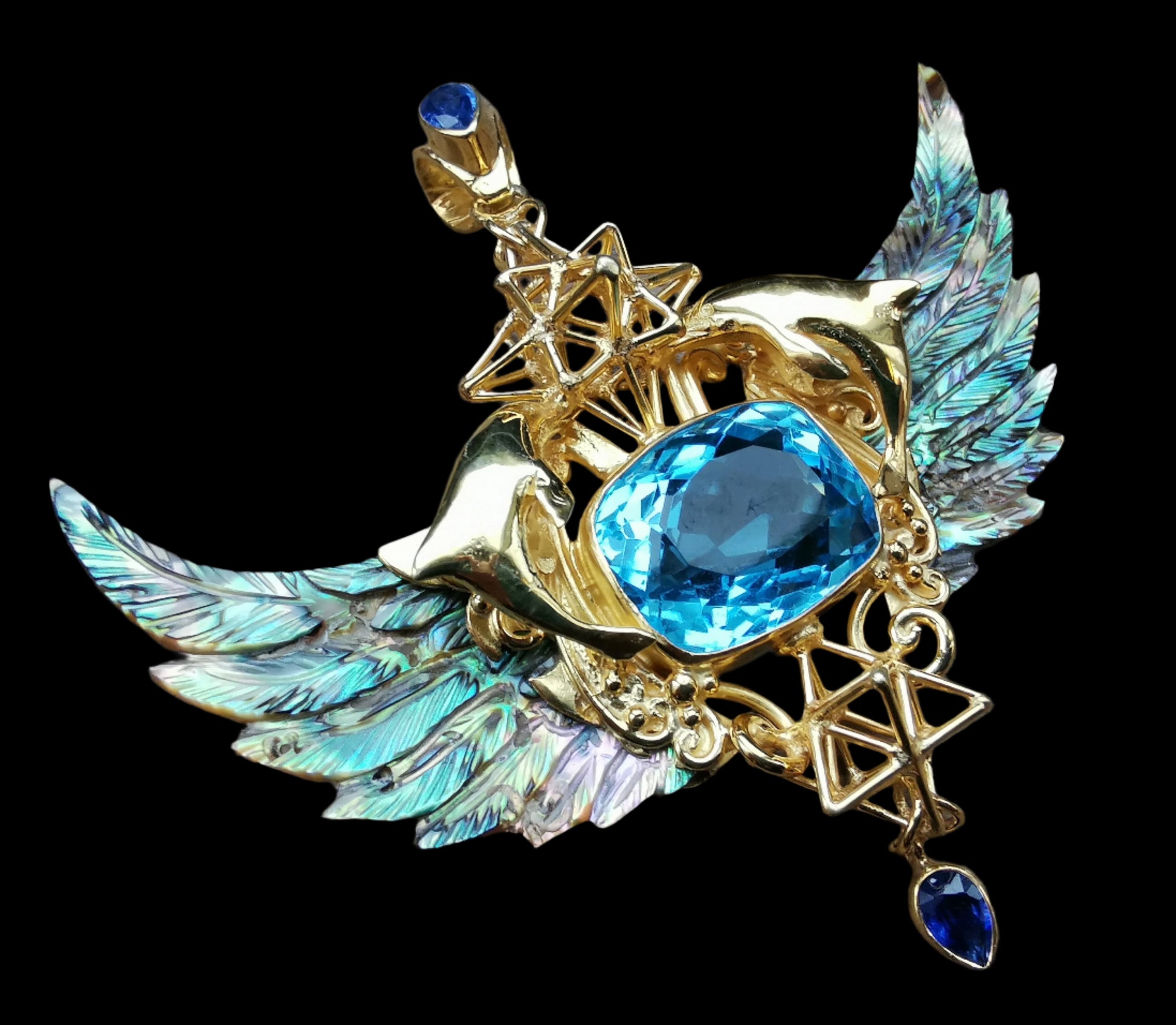 Ref.PD0696 - Gold plated on silver dolphins pendant with Heart Star & Tantric Star geometries, sky blue topaz, and London blue topaz.