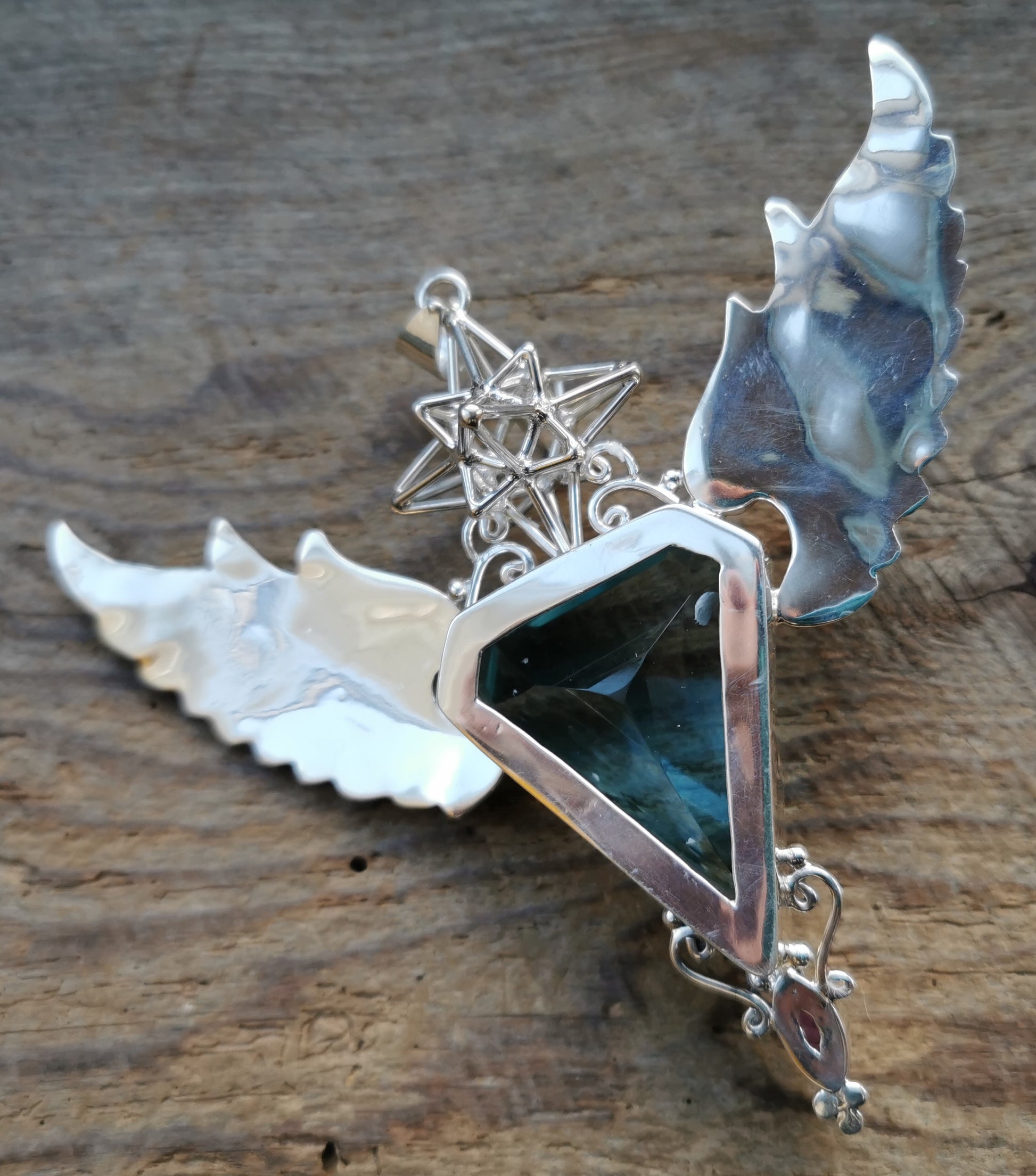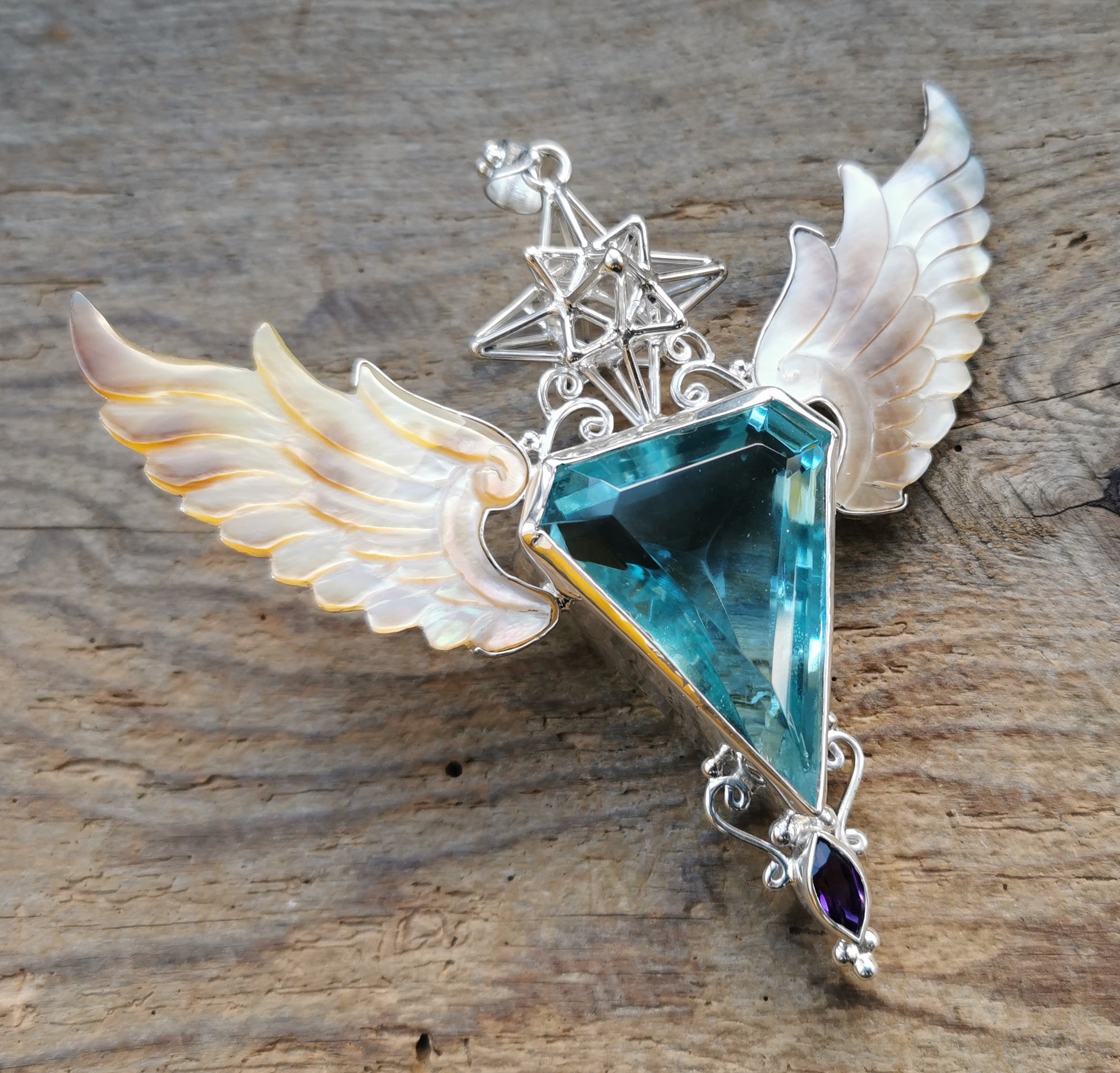 Ref.PD0702 - Silver pendant with Heart Star geometry, mother of pearl carved wings, sky blue topaz, and amethyst gemstones.