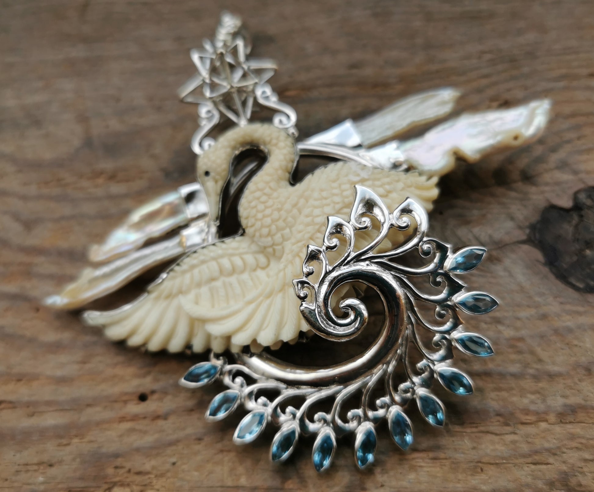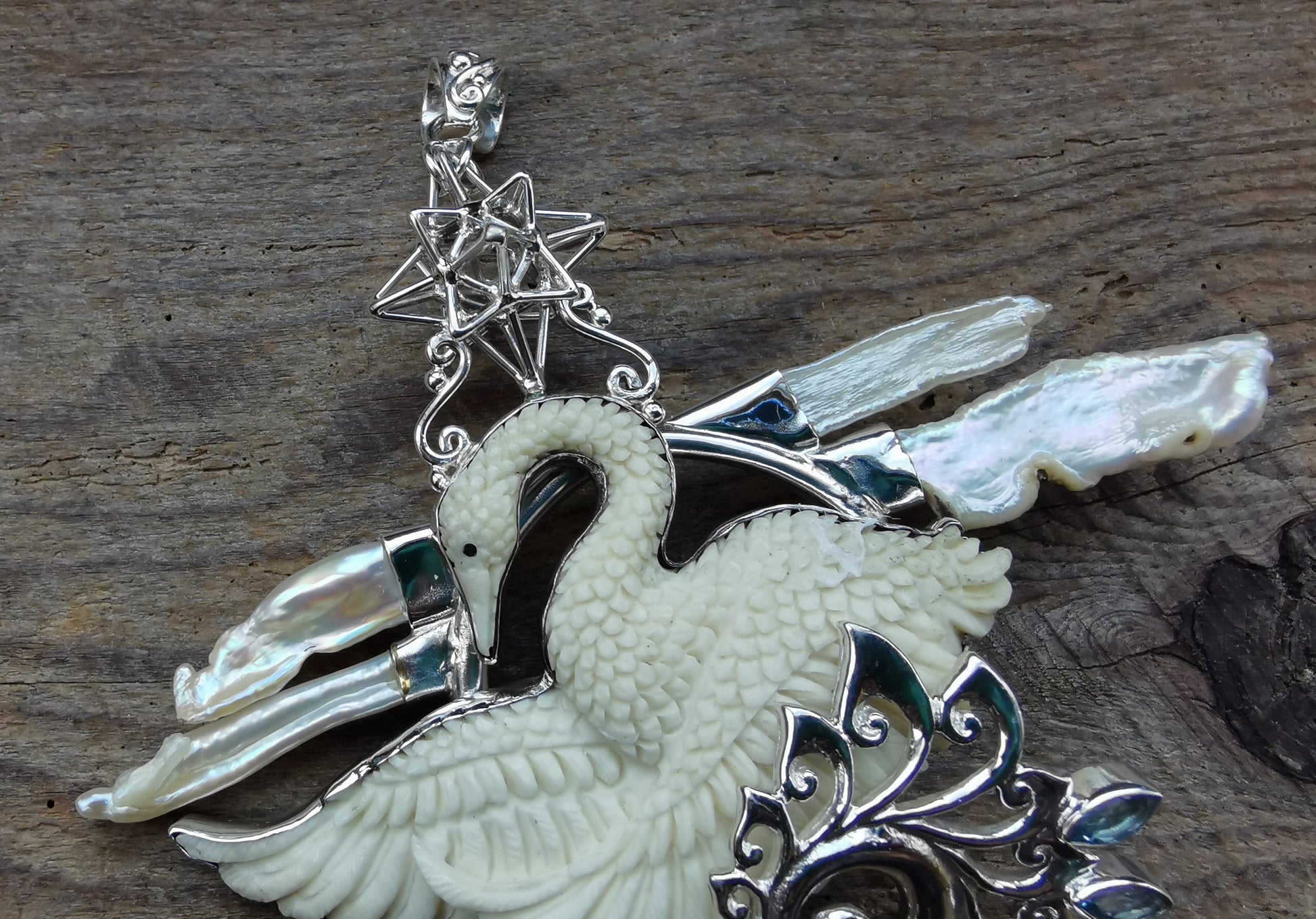 Ref.PD0708 - Silver pendant with Heart Star geometry, ecologically sourced deer horn carved swan, sweet water pearls, and sky blue topaz gemstones.