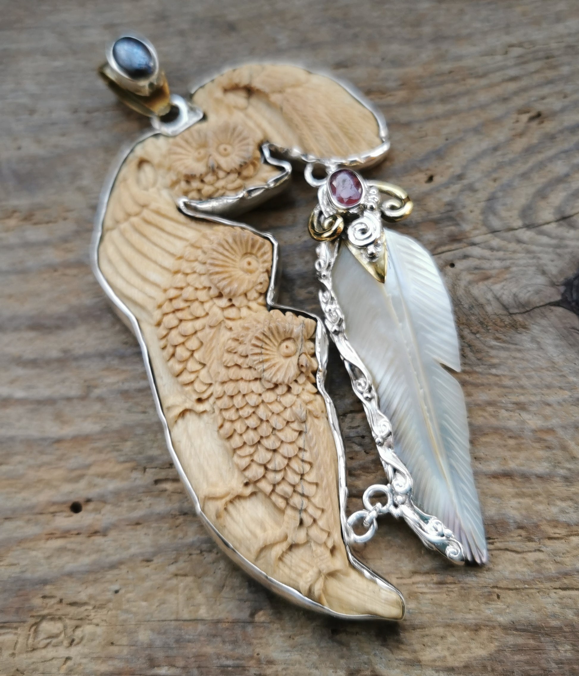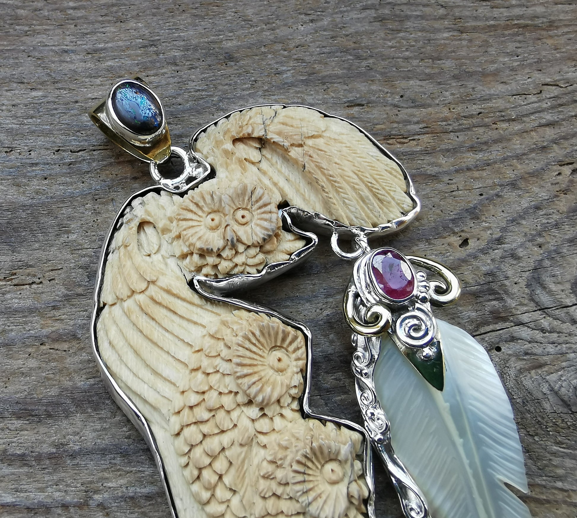 Ref.PD0710 - Silver pendant with mammoth carved owls, mother of pearl carved feather, Australian black opal, and ruby gemstone.