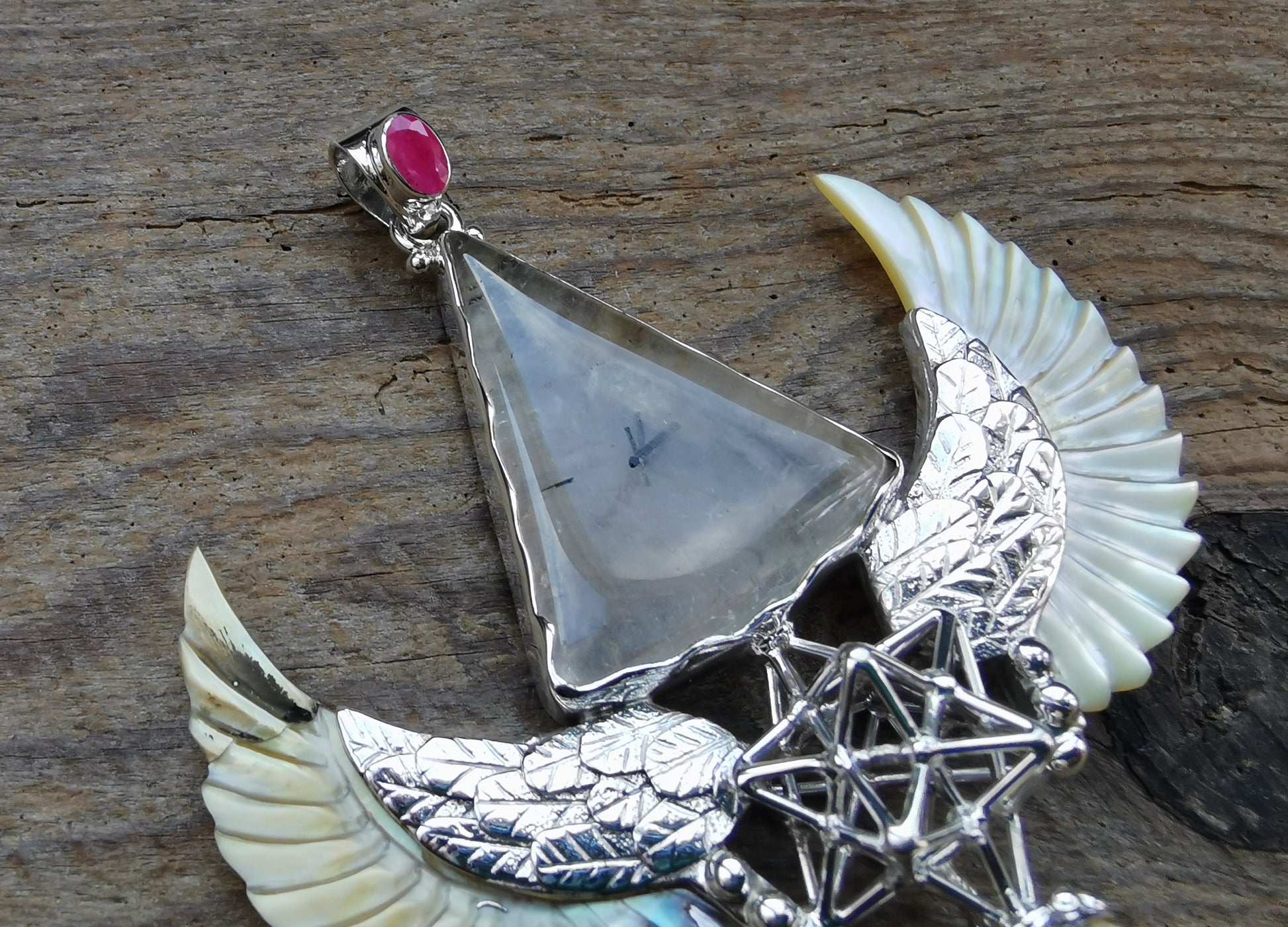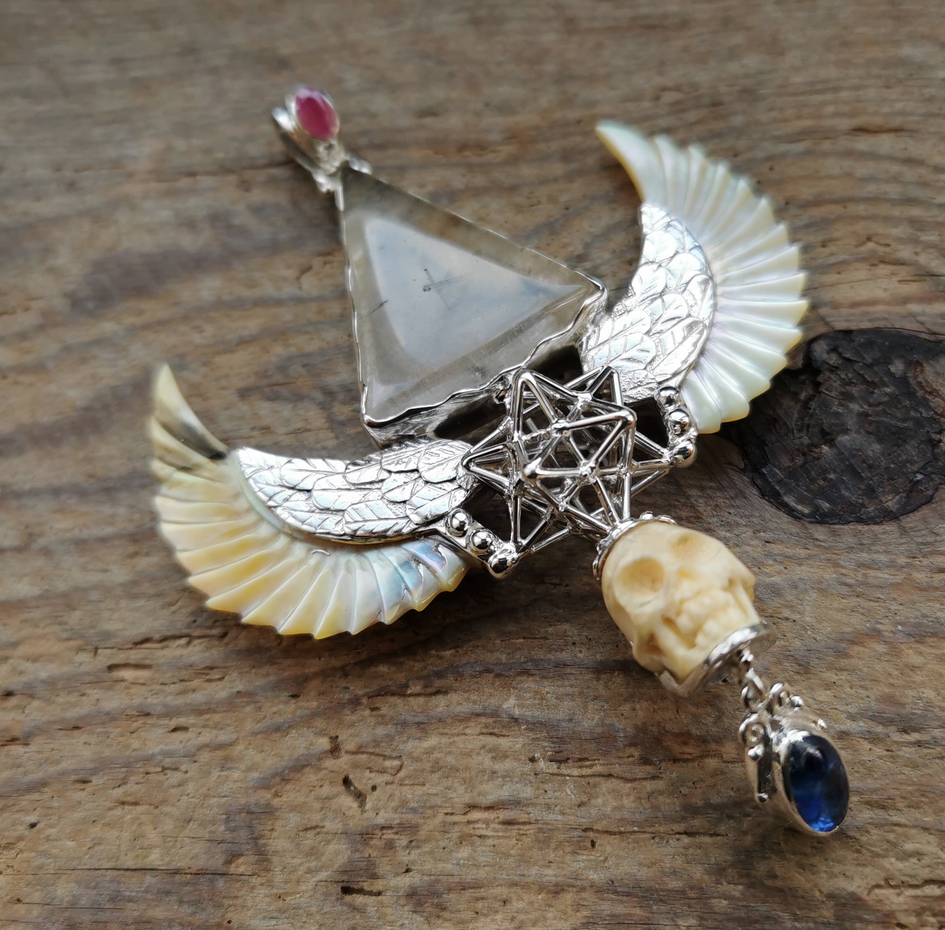 Ref.PD0713 - Silver pendant with Solar Star geometry, mother of pearl carved wings, ecologically sourced deer horn carved human skull, tourmalinated quartz crystal, ruby, and sapphire gemstone.