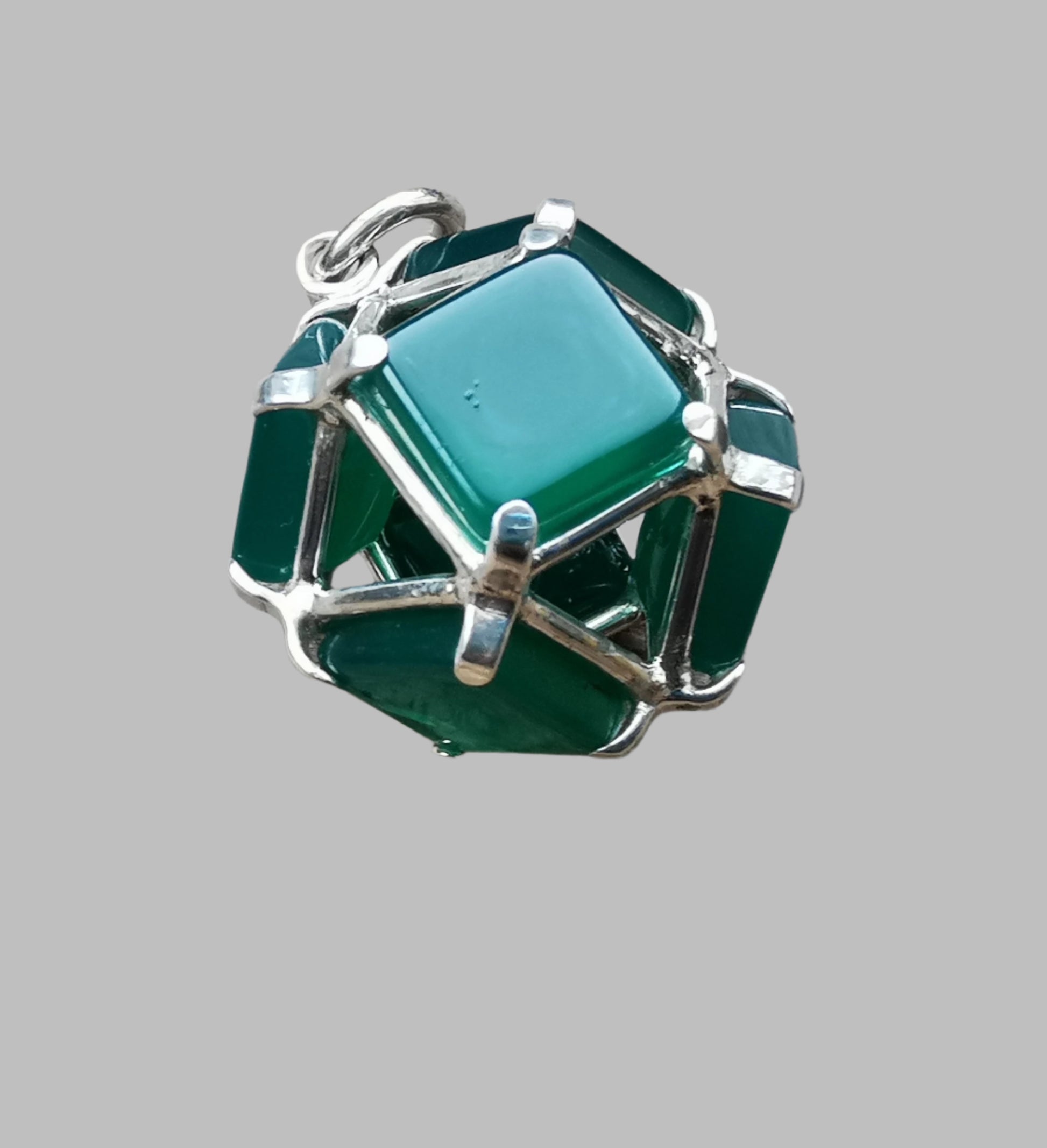 Ref.PD0715 - Silver pendant with Iconic Terra Prana Sphere geometry motif, and green onyx gemstones.