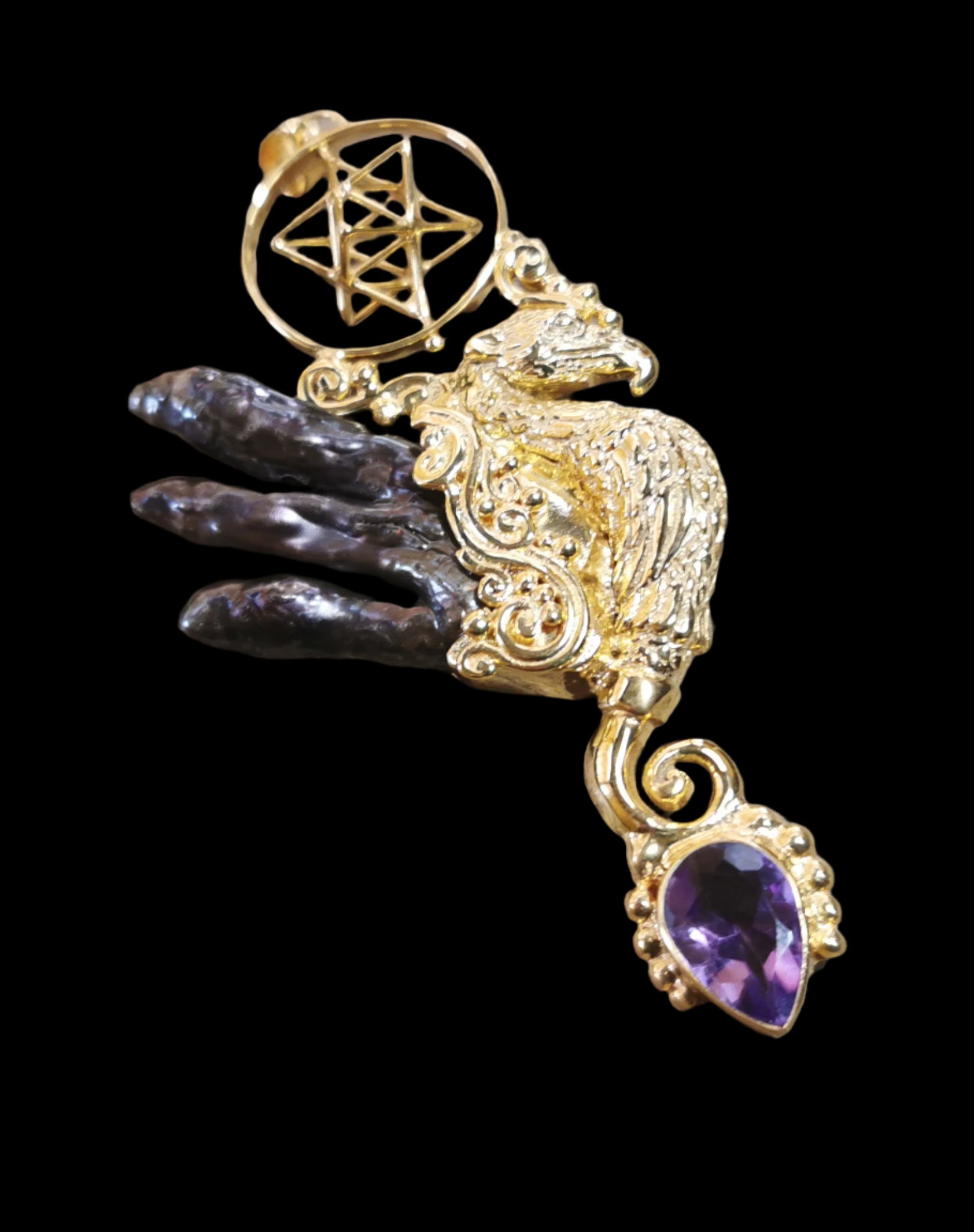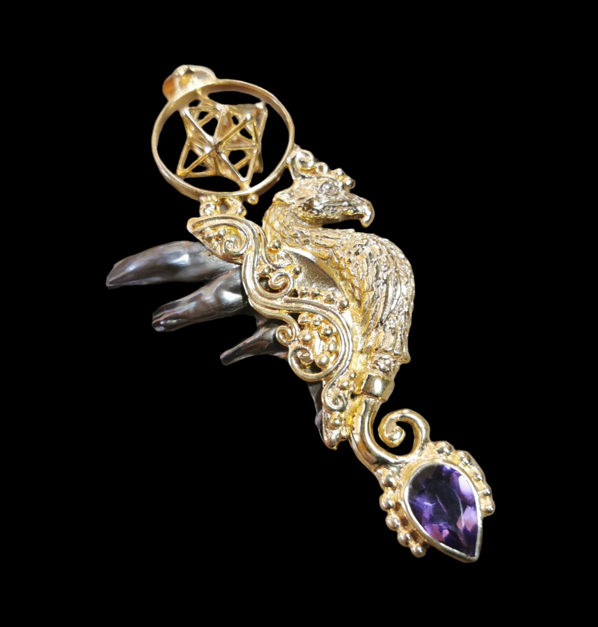 Ref.PD0716 - Gold plated on silver pendant with Tantric Star in circle geometry & dragon motif, sweet water black pearls as wings, and amethyst gemstone.