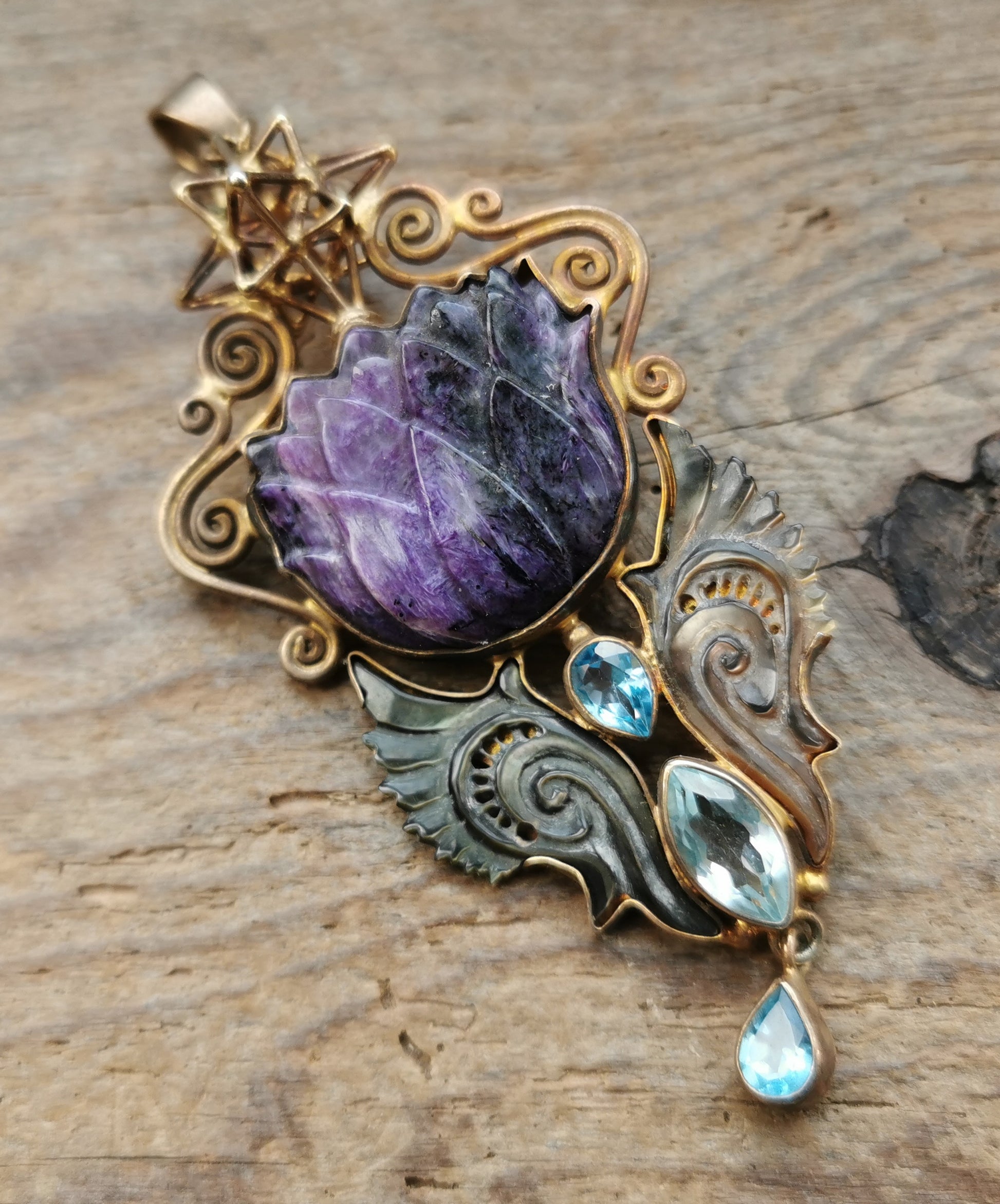 Ref.PD0717 - Vintage gold plated on silver pendant with Heart Star geometry, mother of pearl carved wings, lotus flower carved sugilite, sky blue topaz, and London blue topaz gemstones.