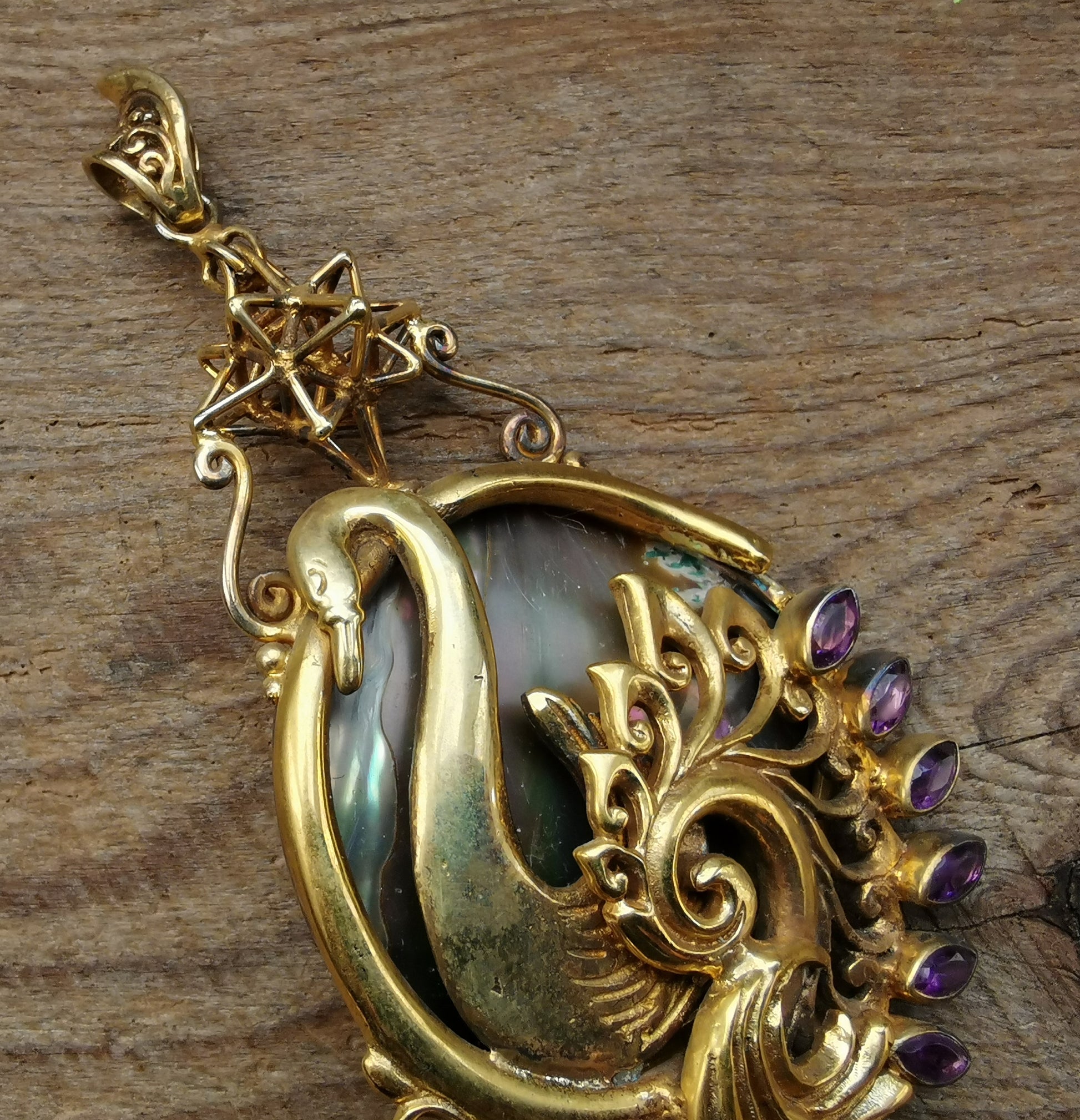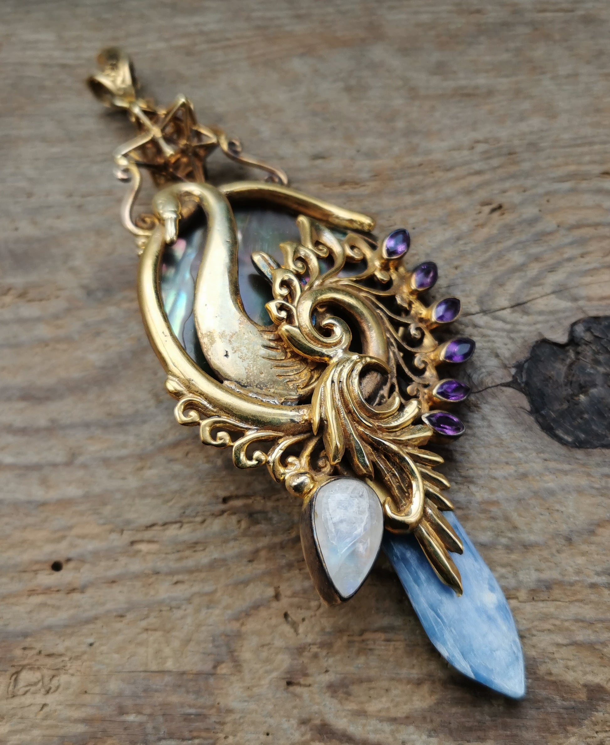 Ref.PD0718 - Vintage gold plated on silver pendant with Heart Star geometry, abalone carved background sky, moonstone, amethyst, and kyanite gemstones.