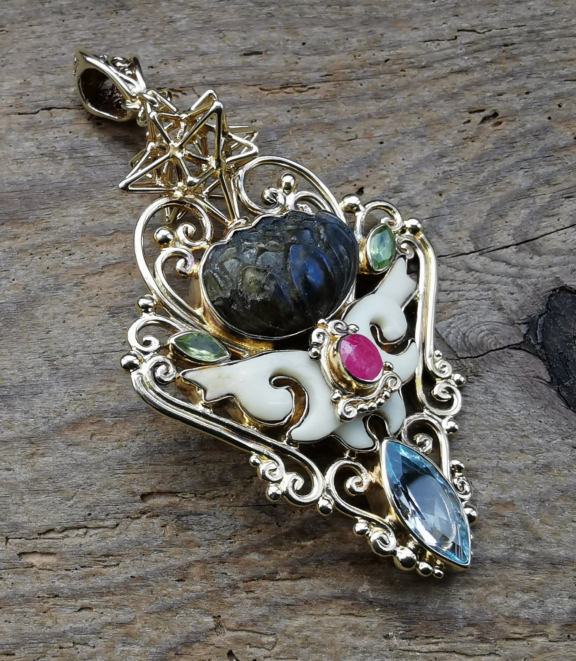 Ref.PD0721 - Gold plated on silver pendant with Heart Star geometry, labradorite carved lotus flower, ecologically sourced deer horn carved leaves, ruby, peridot, and sky blue topaz gemstones.