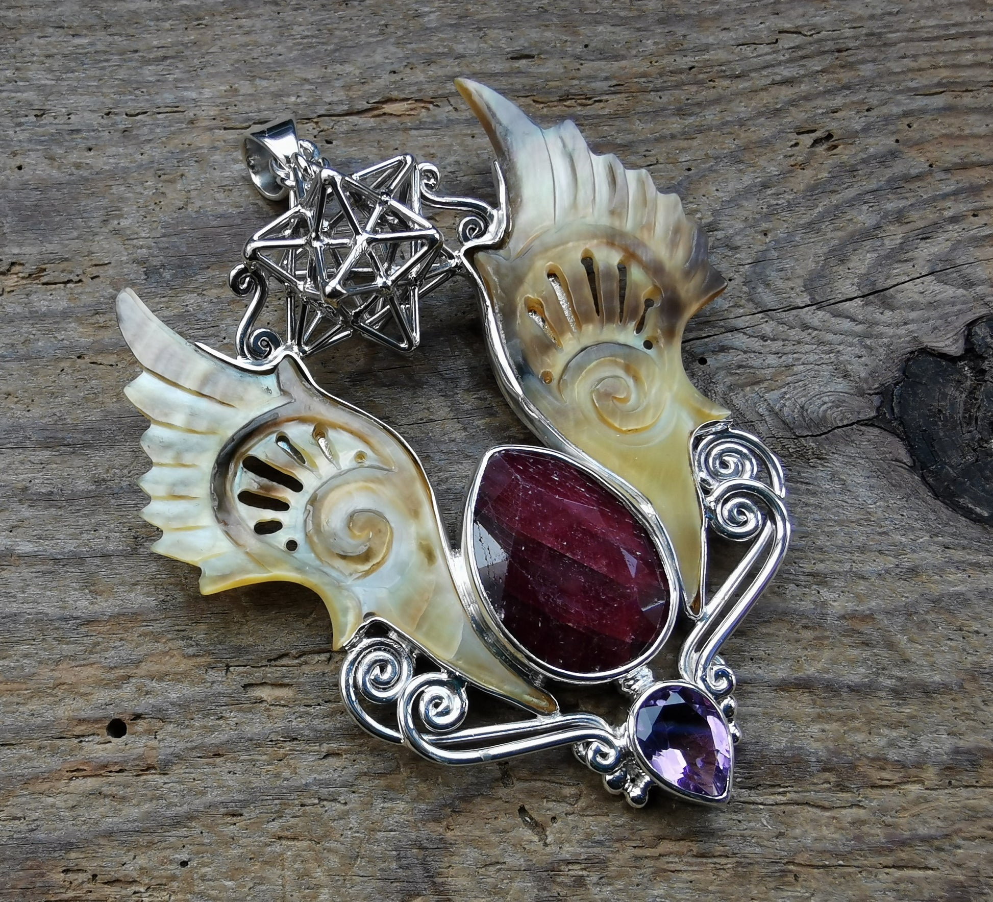Ref.PD0725 - Silver pendant with Solar Star geometry, mother of pearl carved wings, ruby, and amethyst gemstones.