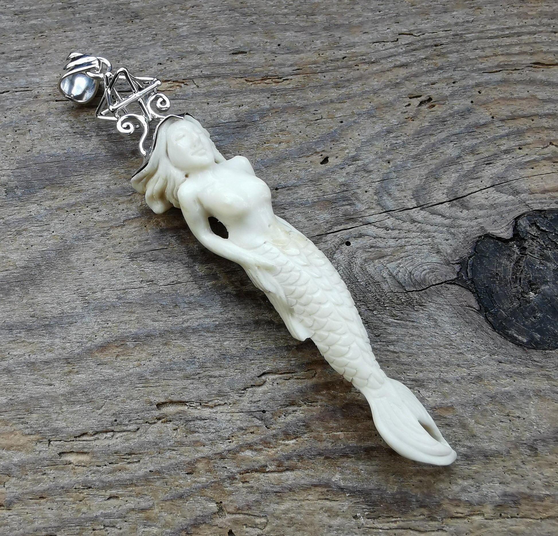 Ref.PD0726 - Silver pendant with Star Tetrahedron geometry, and ecologically sourced deer horn carved mermaid.