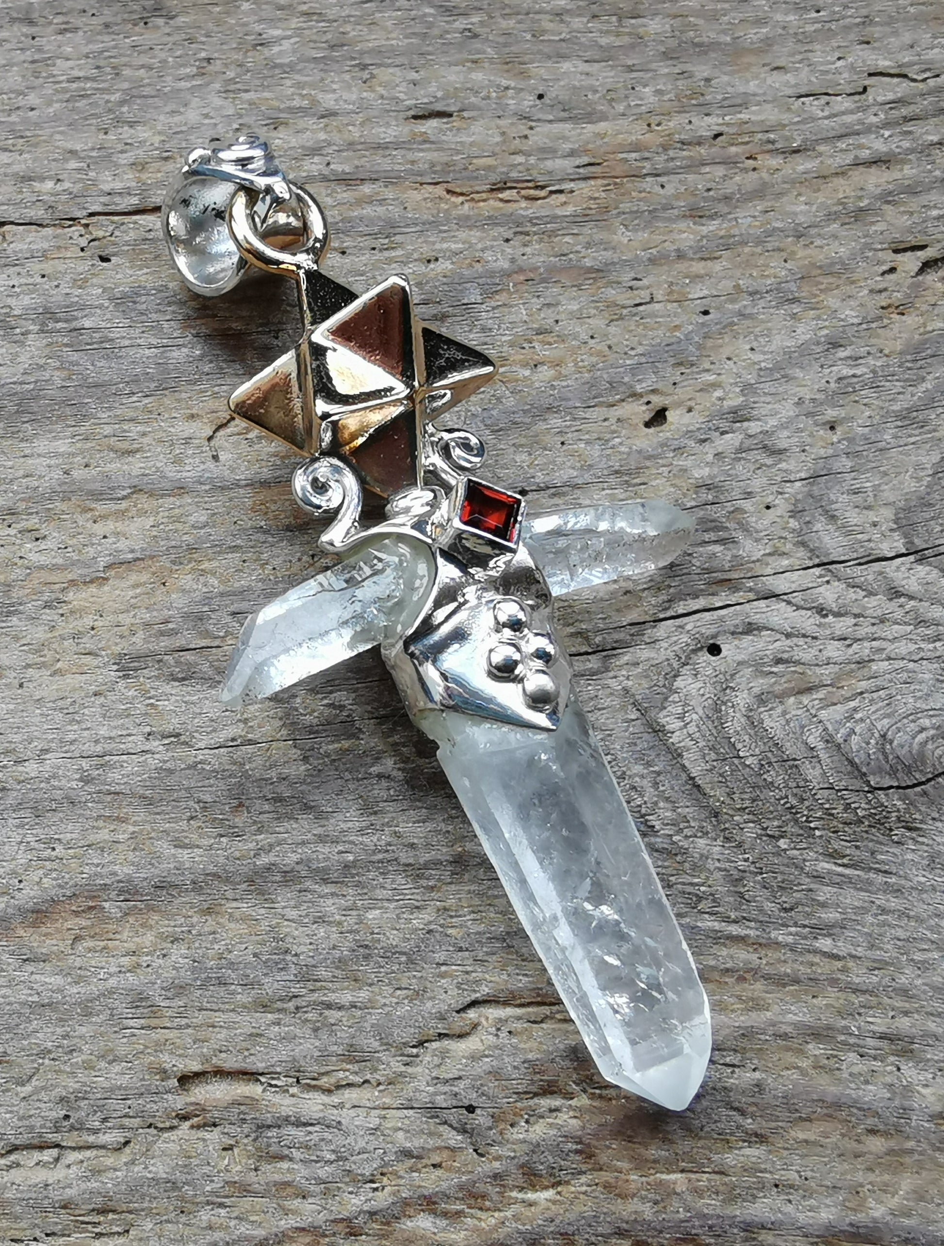 Ref.PD0727 - Silver pendant with brass Tantric Star geometry, laser quartz crystal, and garnet gemstone.