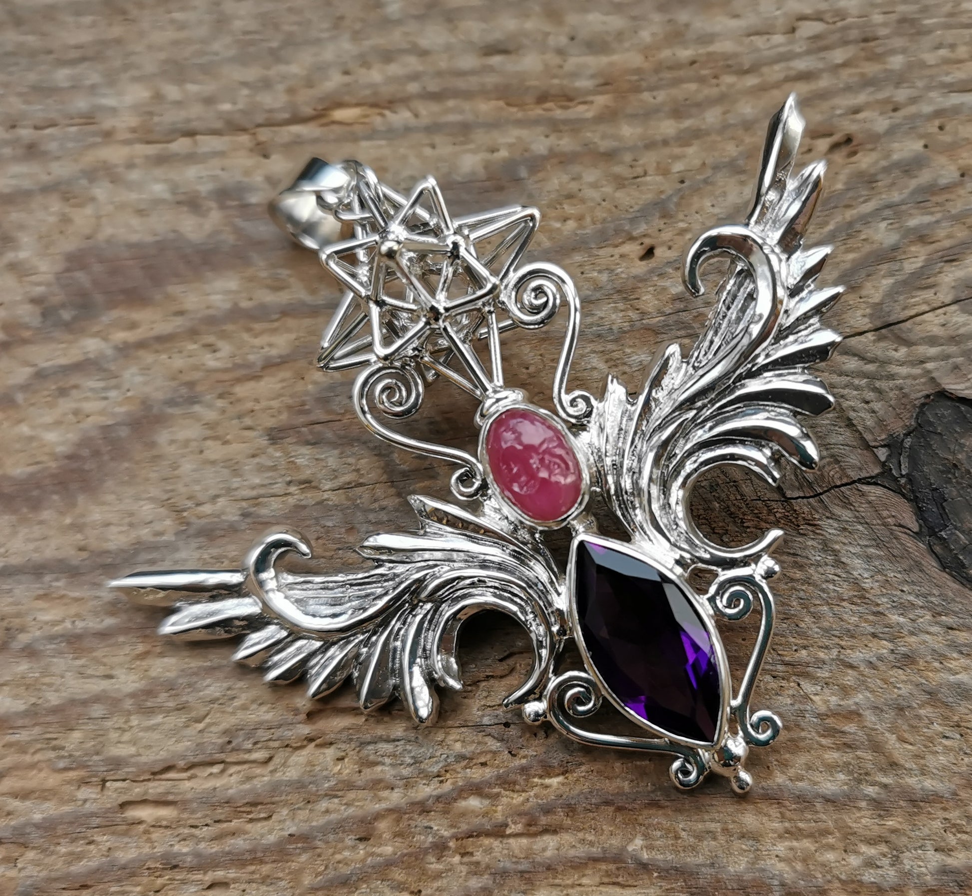 Ref.PD0731 - Silver pendant with Heart Star geometry, ruby, and amethyst gemstones.