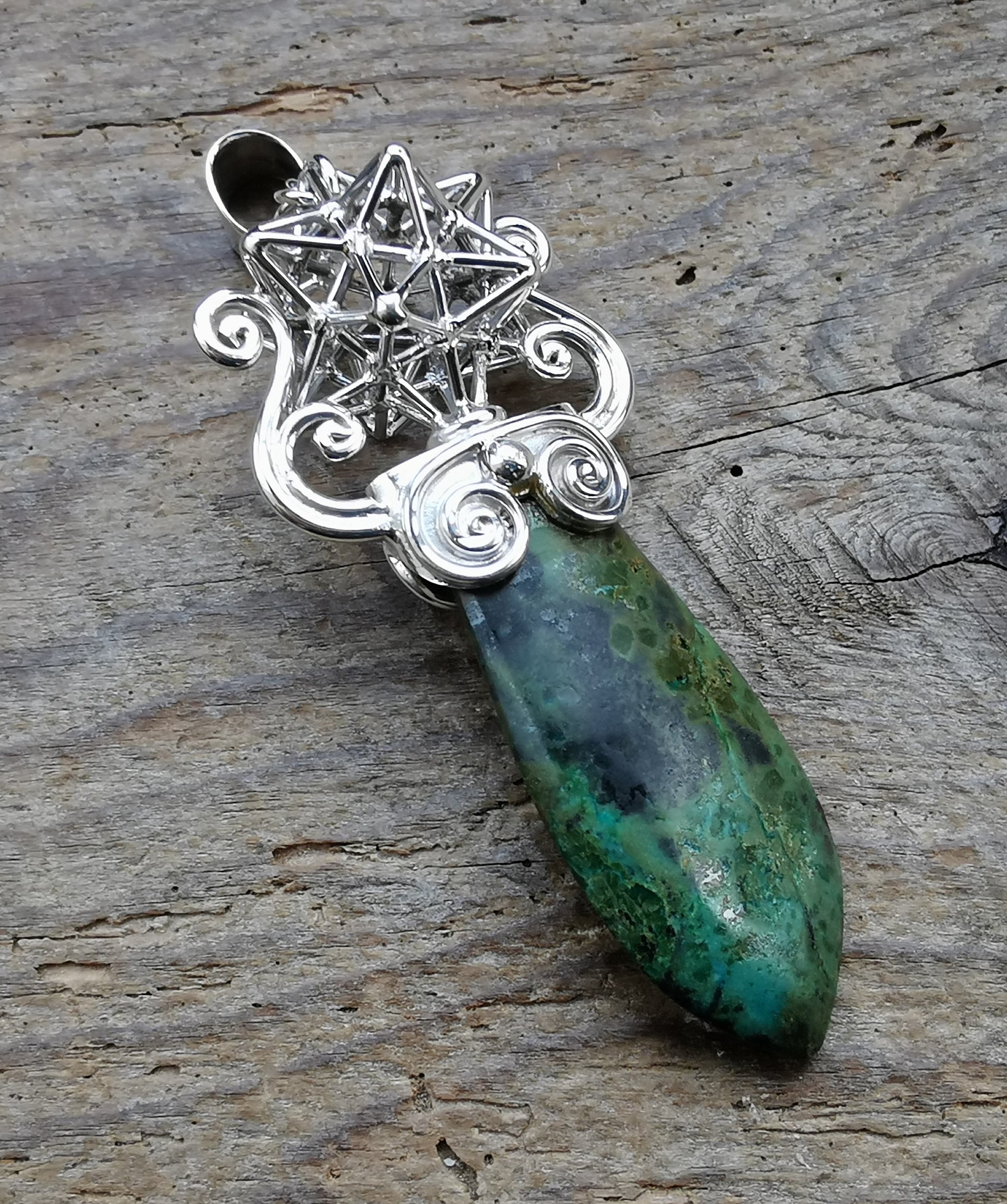 Ref.PD0734 - Silver pendant with Solar Star geometry, and malachitea/zurite gemstone.
