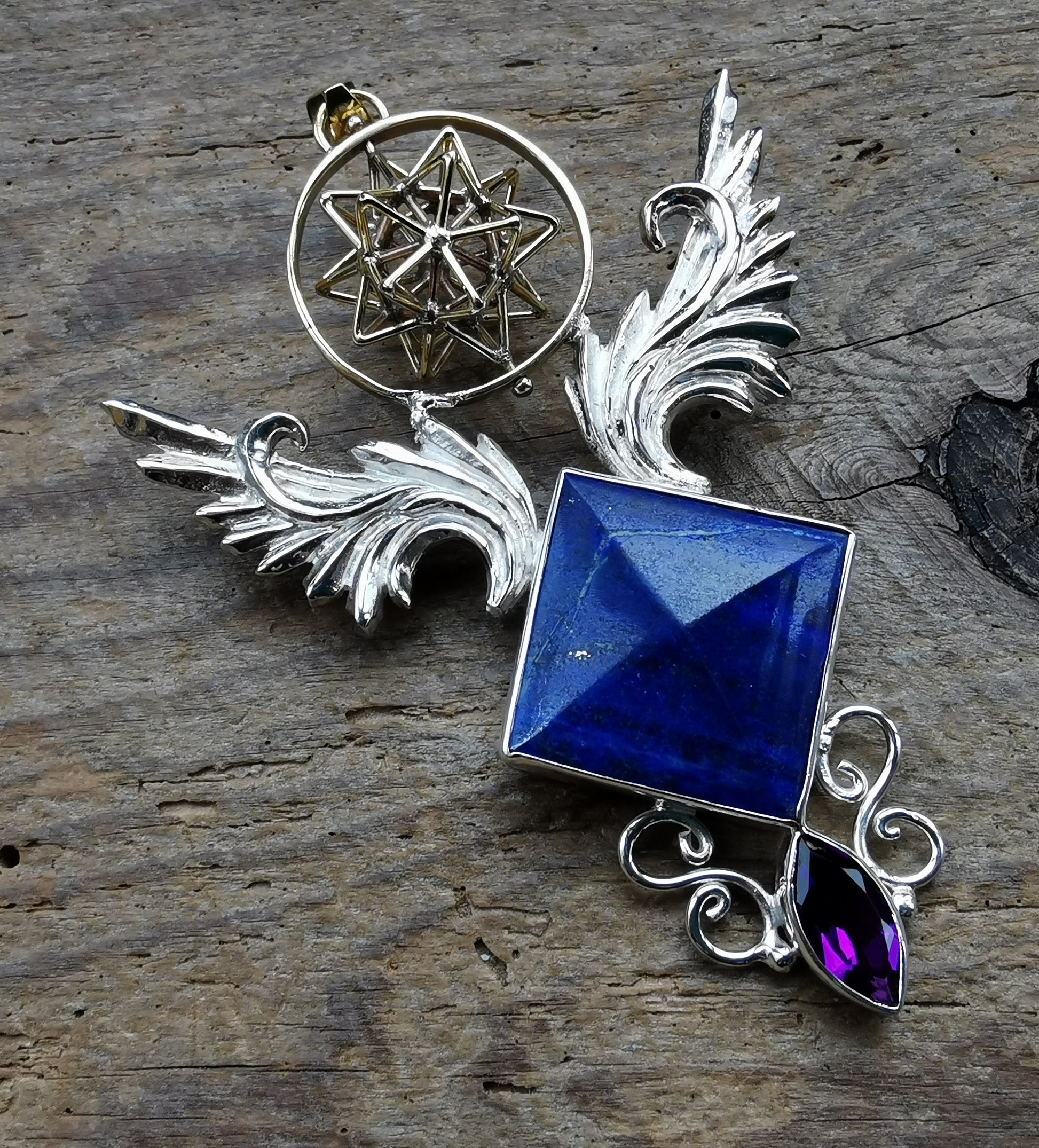 Ref.PD0735 - Silver pendant with brass Water Star geometry in circle, lapis lazuli, and amethyst gemstones.