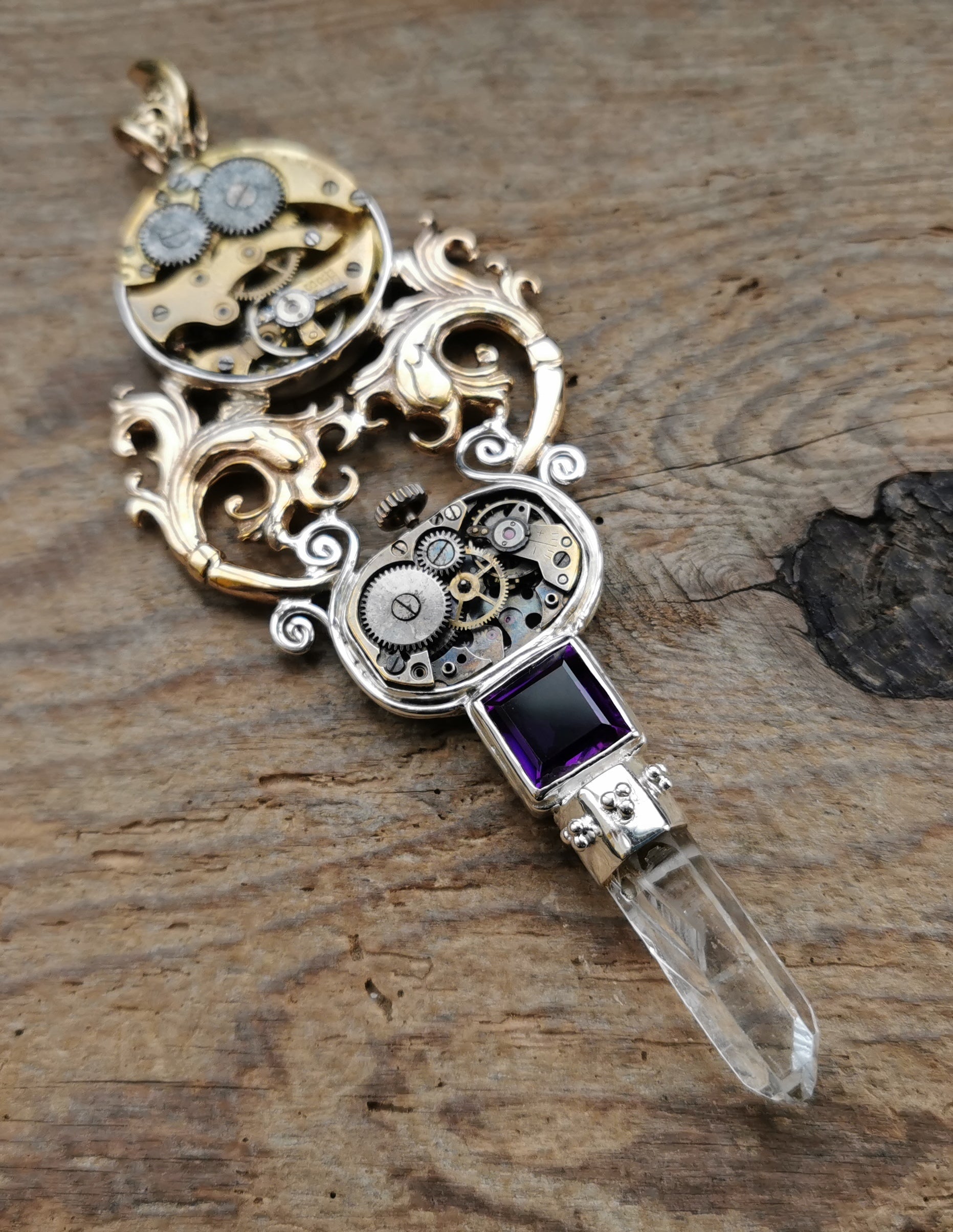 Ref.PD0741 - Silver/brass pendant with old watches mechanism, laser quartz crystal, and amethyst gemstone.