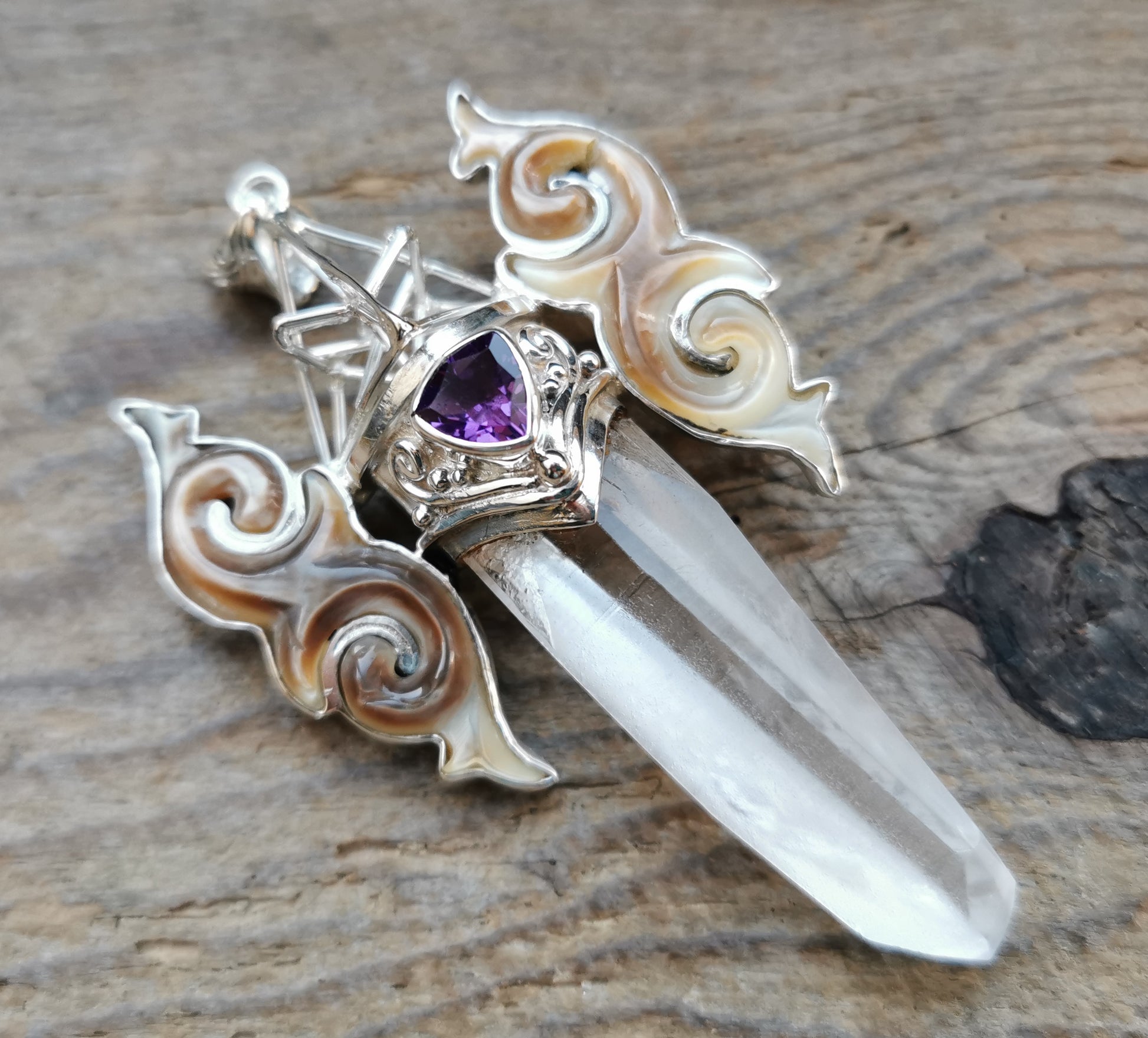 Ref.PD0743 - Silver pendant with Hyper Tetrahedron geometry, mother of pearl carved wings, laser quartz crystal, and amethyst gemstones.