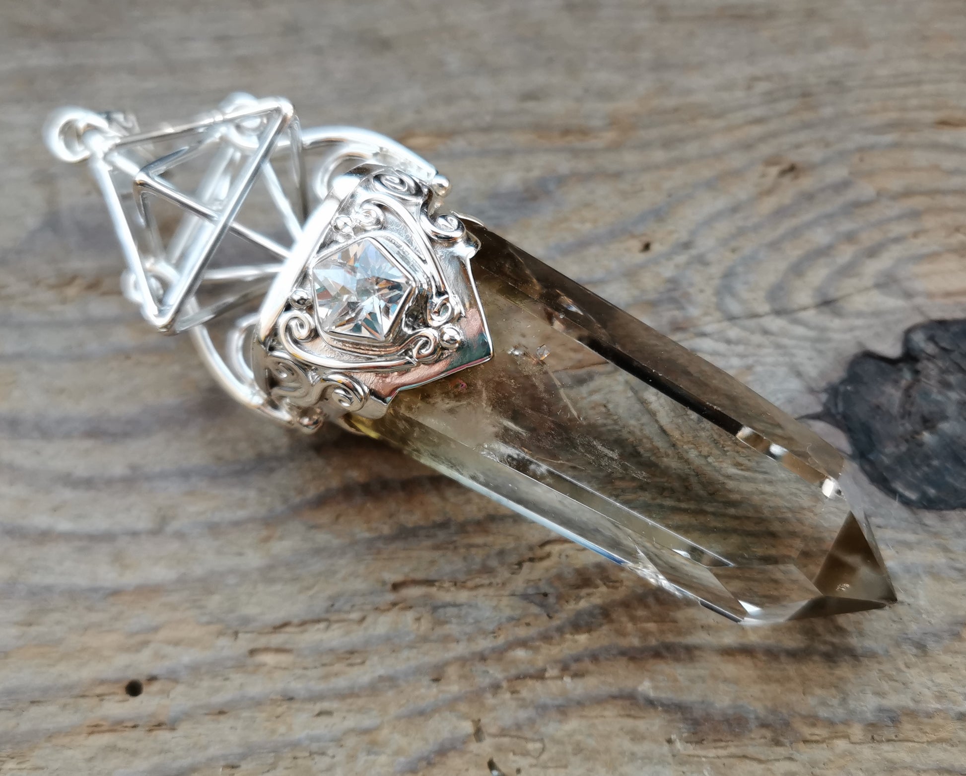 Ref.PD0745 - Silver pendant with Hyper Tetrahedron geometry, smoky citrine, and zircon gemstones.