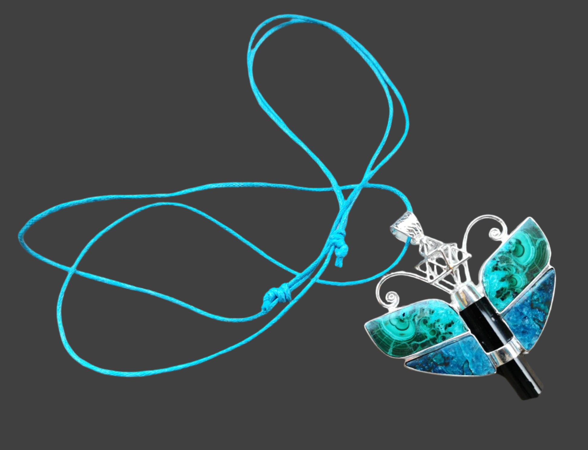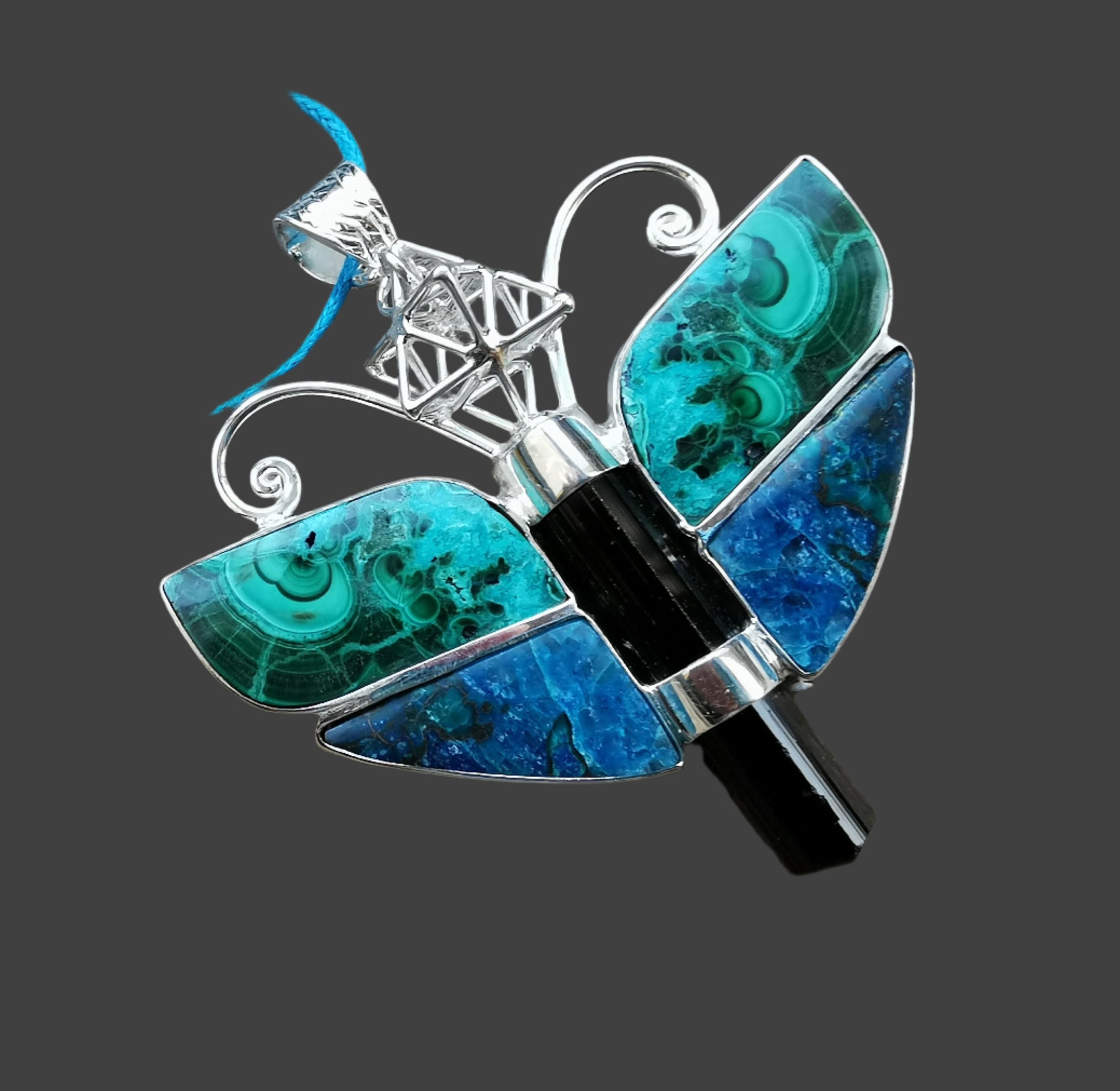 Ref.PD0749 - Silver pendant with Tantric Star geometry, tourmaline, malachite, and azurite gemstones.