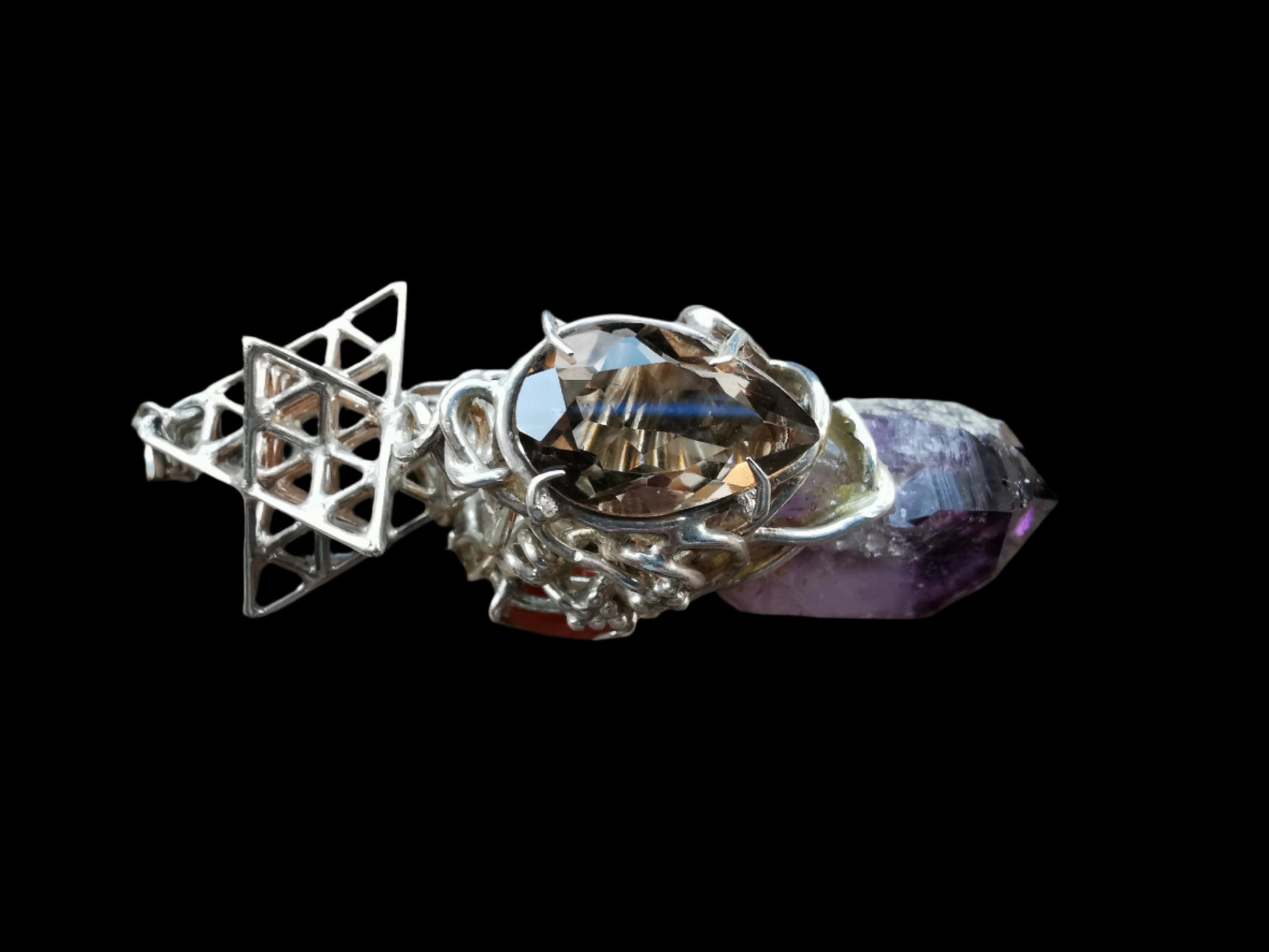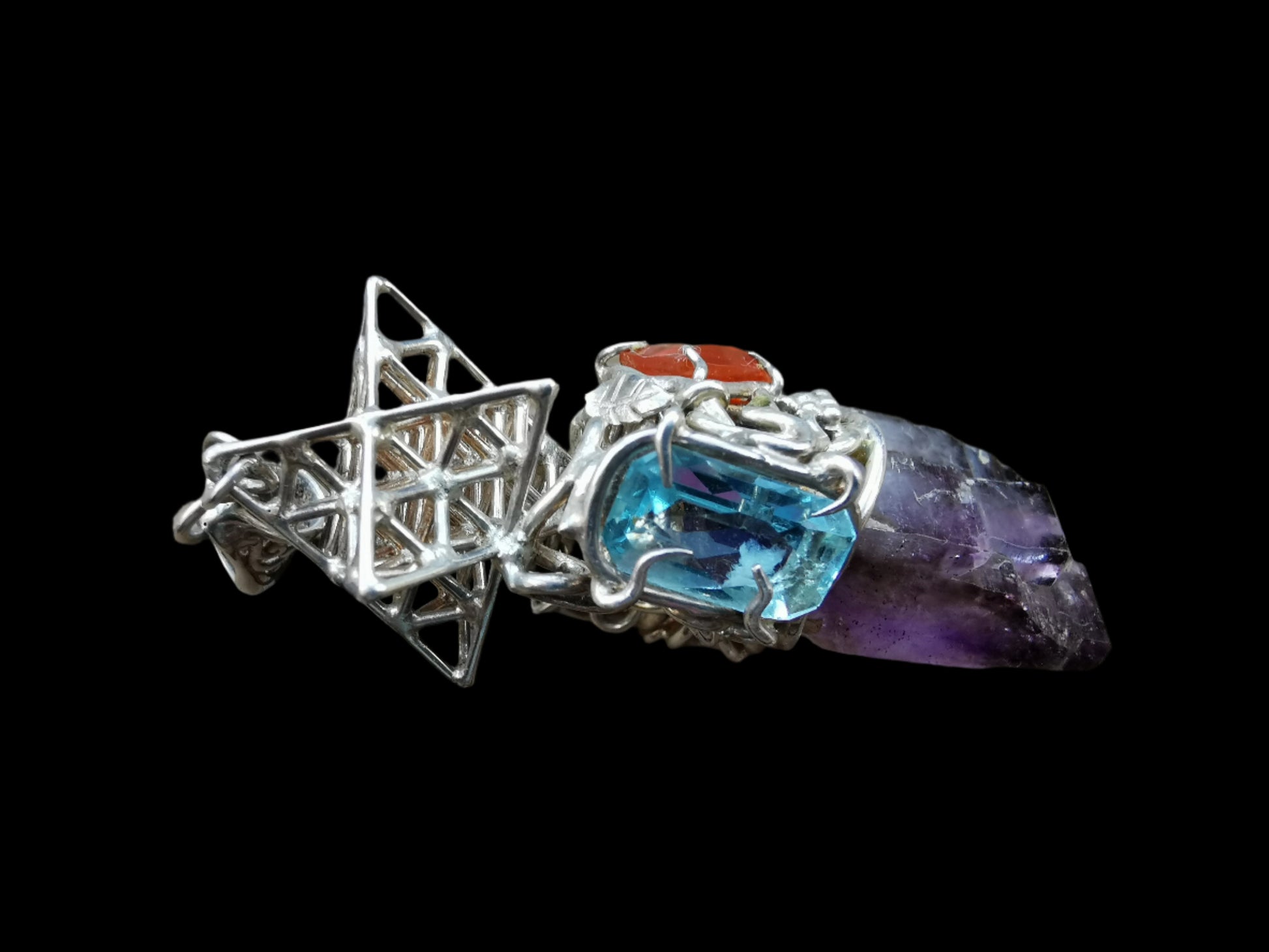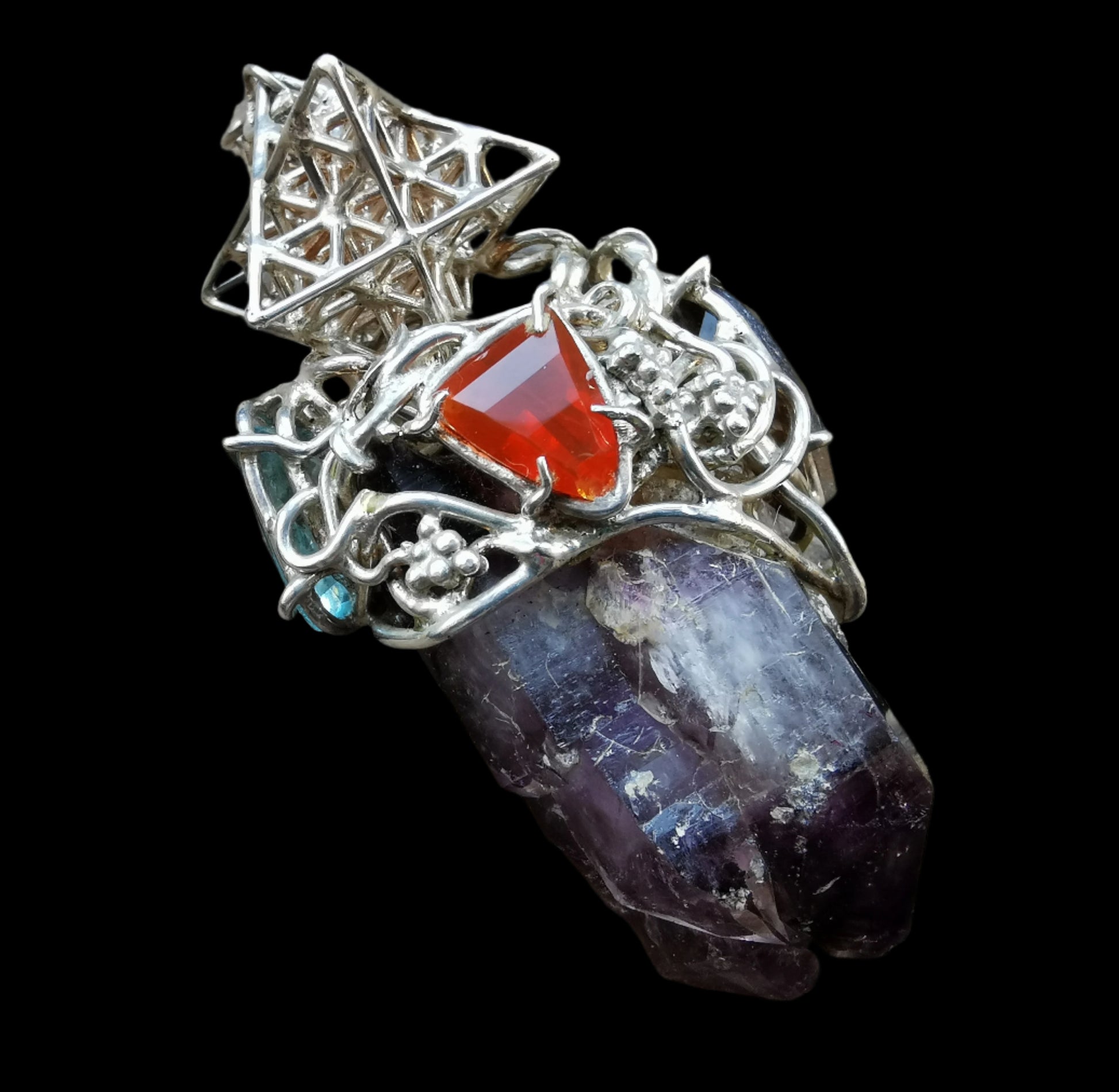 Ref.PD0752 - Silver pendant with Tantric Matrix geometry, Brandberg quartz crystal, aquamarine, smoky topaz, and Mexican opal gemstones.