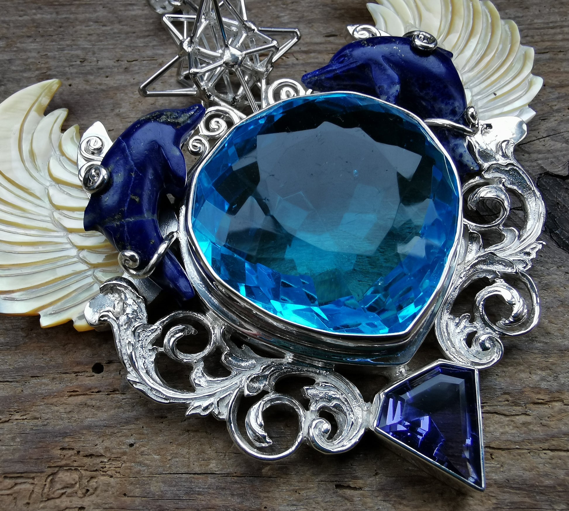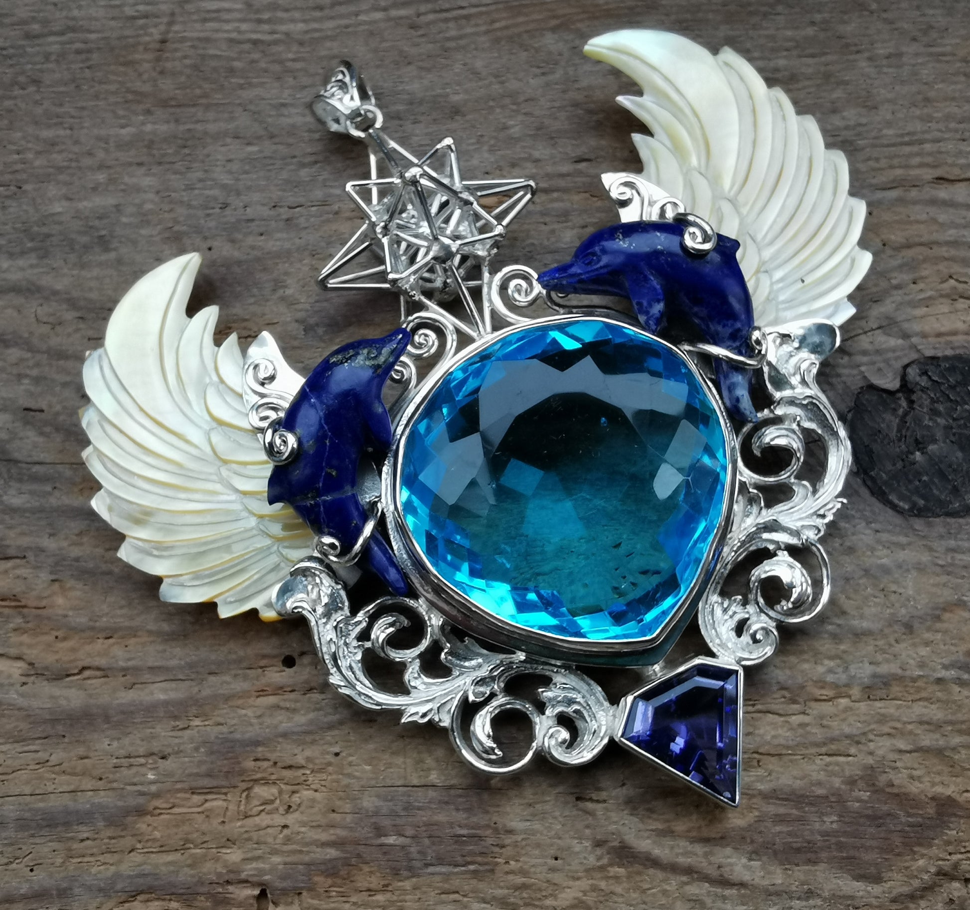 Ref.PD0754 - Silver pendant with Heart Star geometry, mother of pearl carved wings, lapis lazuli carved dolphins, London topaz, and amethyst gems.