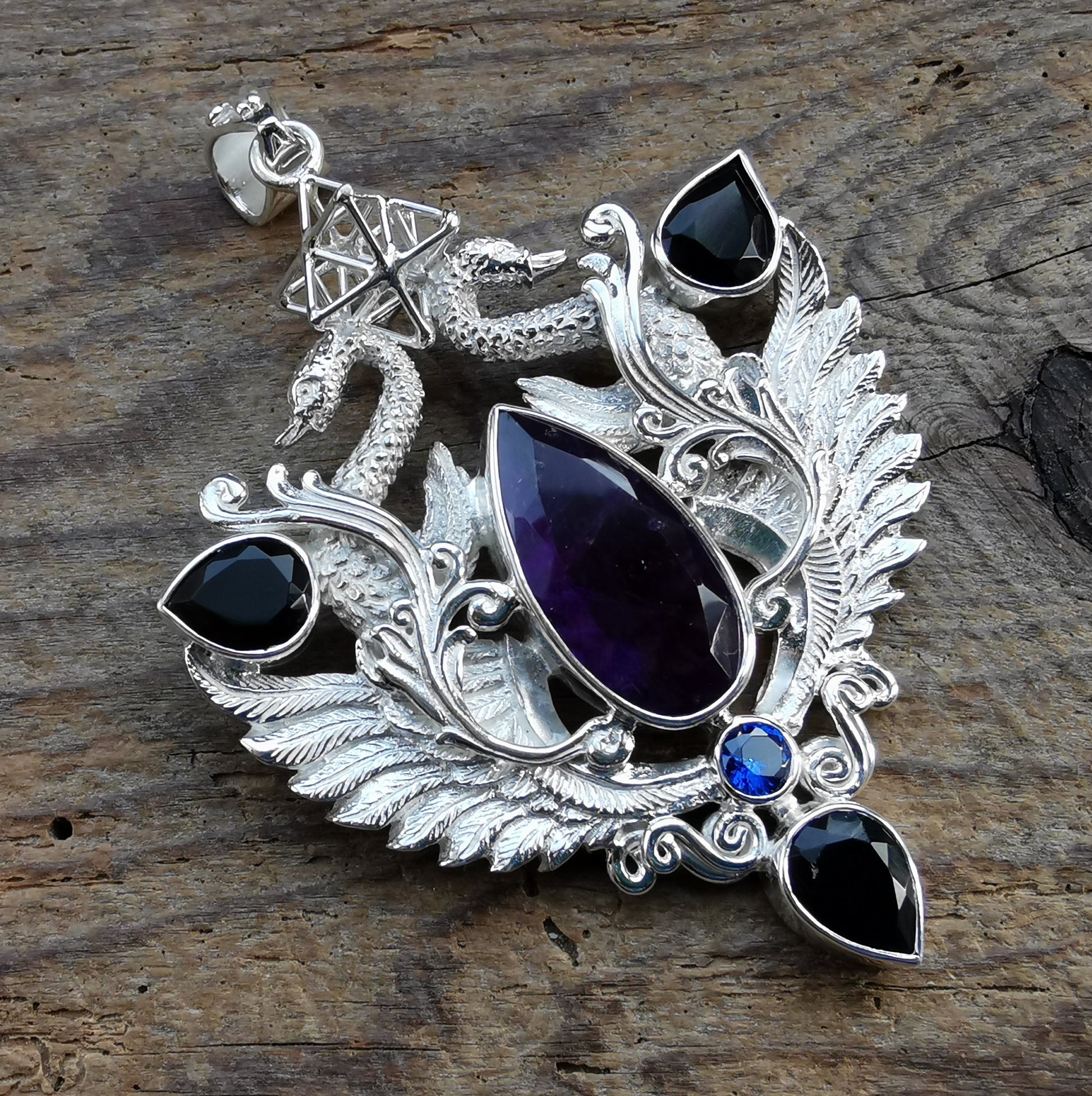 Ref.PD0756 - Silver pendant with swans & Tantric Star geometry motifs, black opal, sapphire, and amethyst gemstones.