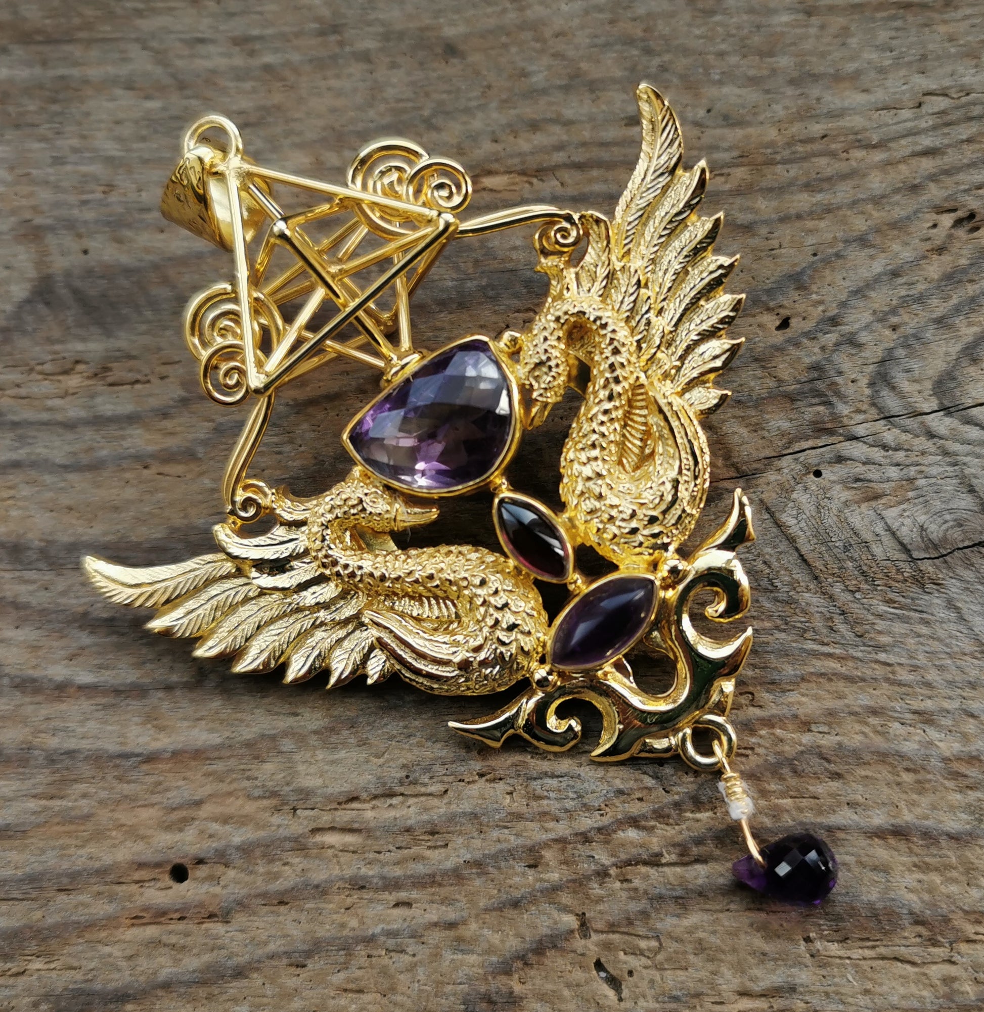 Ref.PD0757 - Gold plated on silver pendant with swans & Hyper Tetrahedron geometry, plus chalice decorated with amethyst & garnet gemstones.