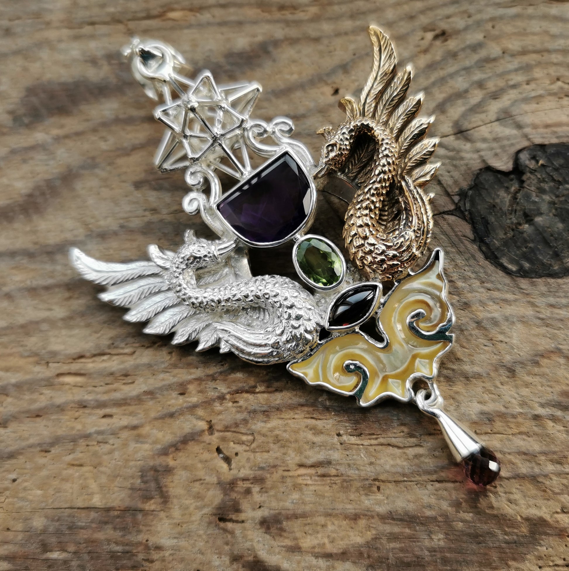 Ref.PD0759 - Silver pendant with Heart Star geometry, silver swan + brass swan, mother of pearl carved Tibetan cloud, and a chalice decorated with garnet, peridot, and amethyst gems.
