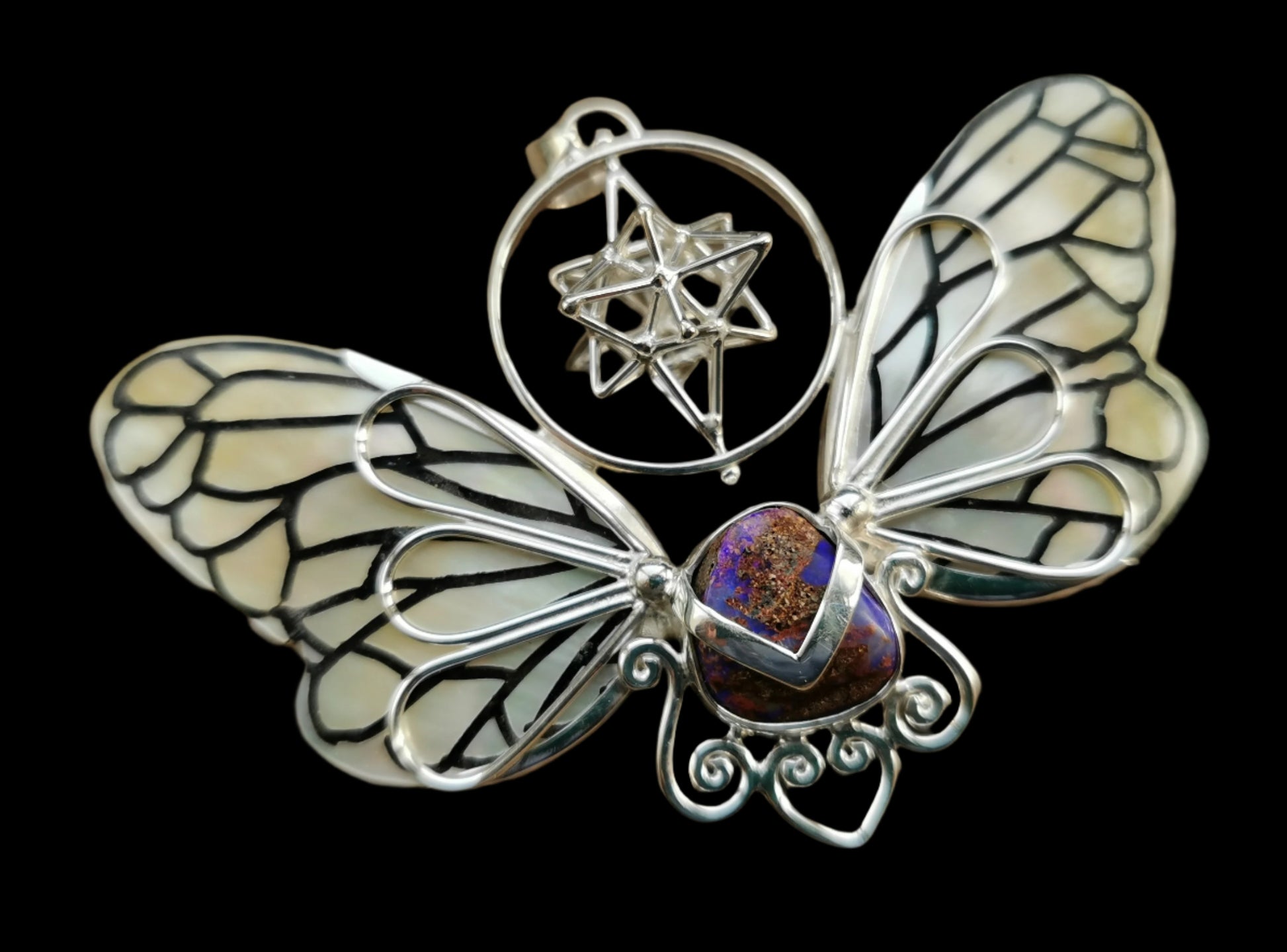 Ref.PD0760 - Silver pendant with Heart Star geometry in circle, mother of pearl carved wings, and opal matrix gem.
