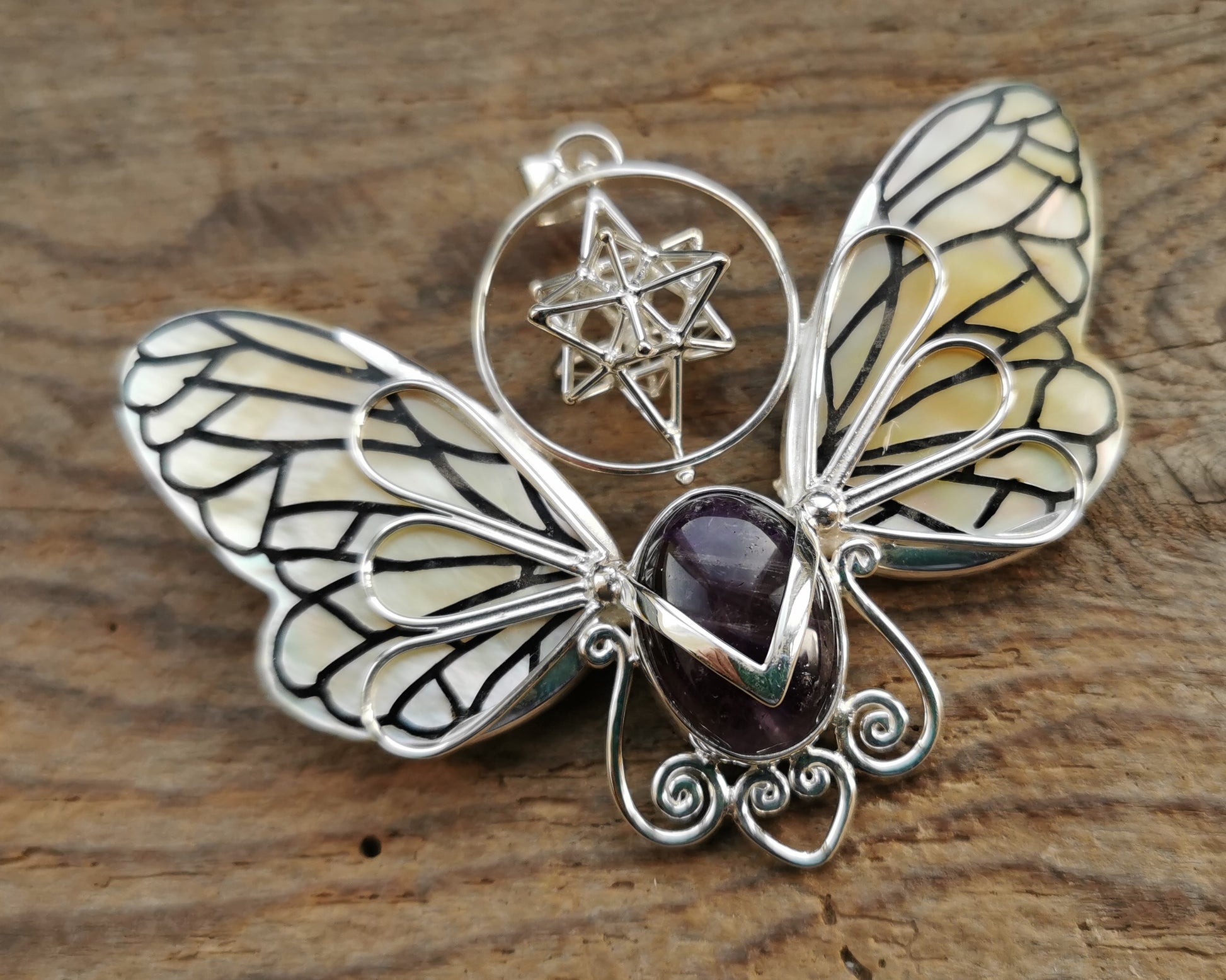 Ref.PD0761 - Silver pendant with Heart Star geometry in circle, mother of pearl carved wings, and amethyst gem.