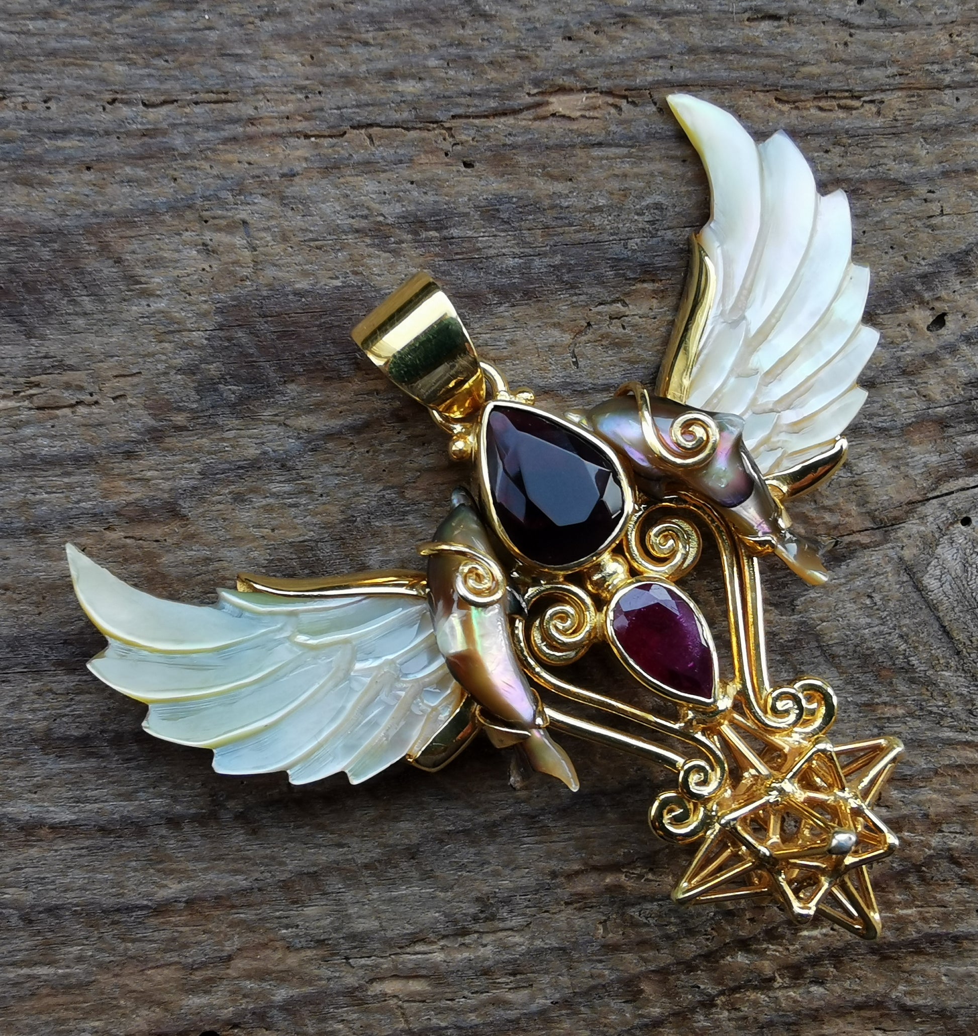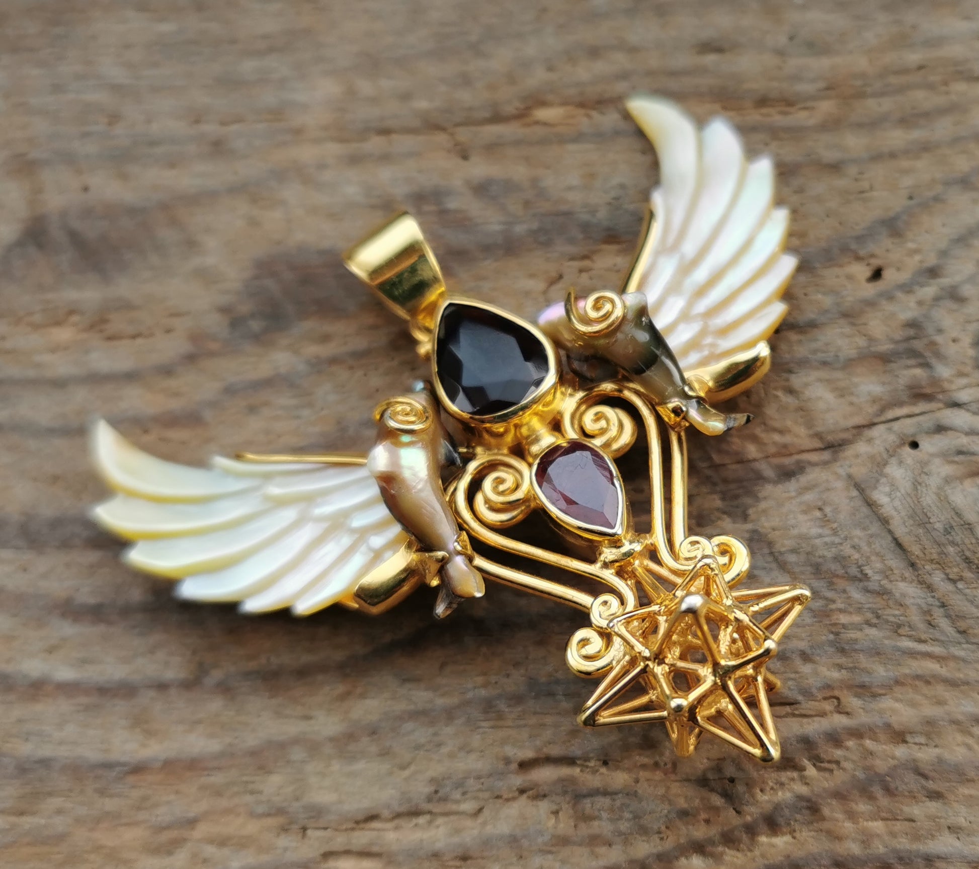 Ref.PD0770 - Gold plated on silver pendant with Heart Star geometry, mother of pearl carved dolphins & wings, and garnet gemstones.
