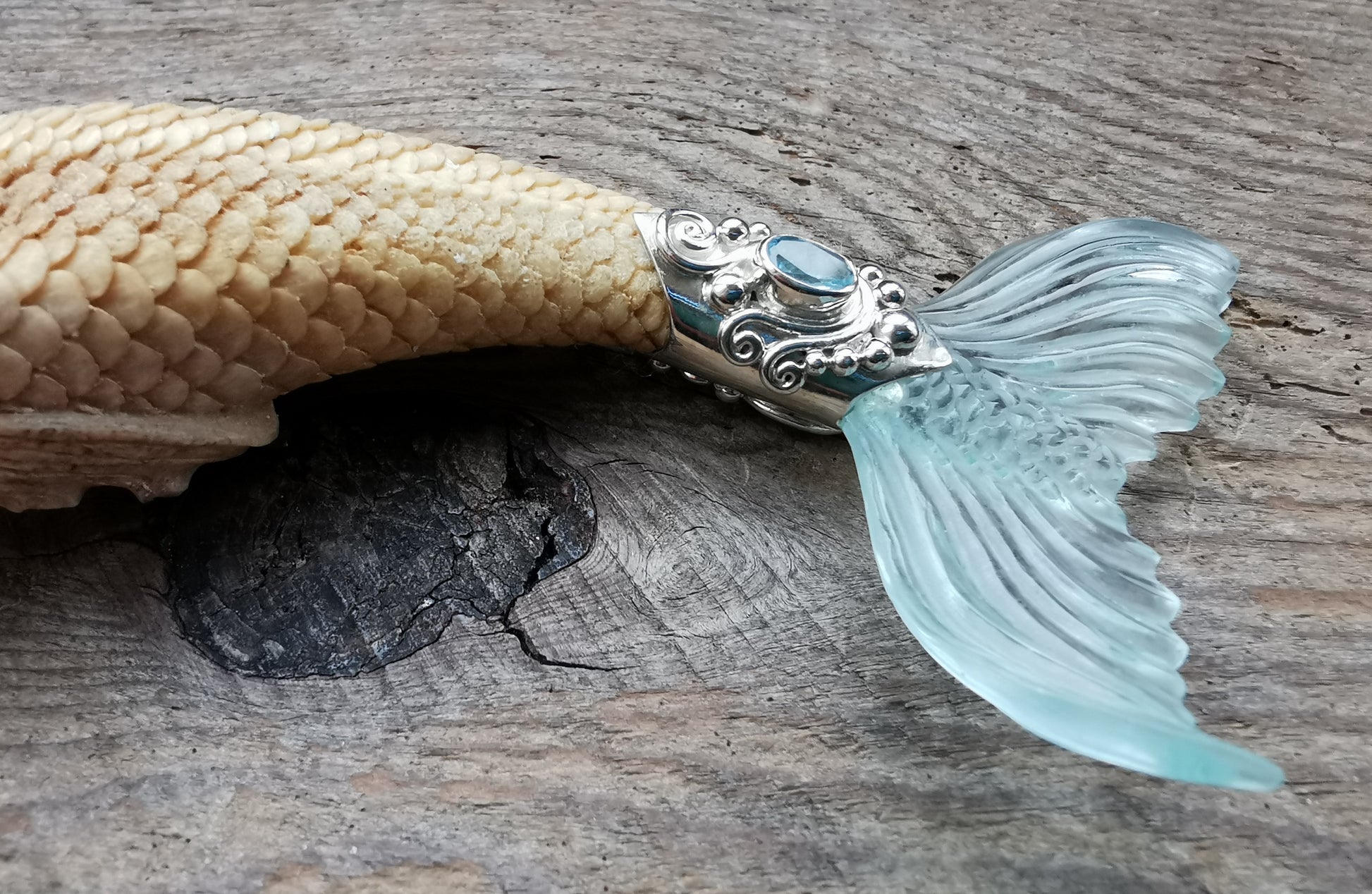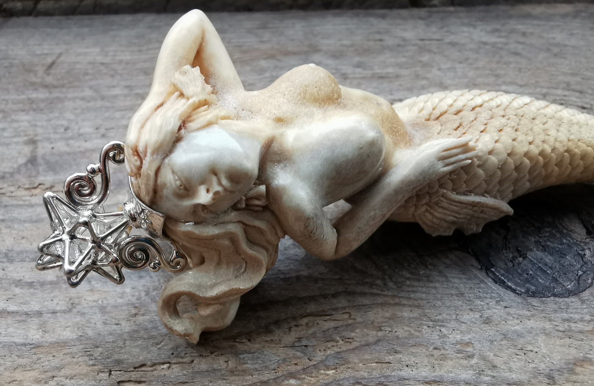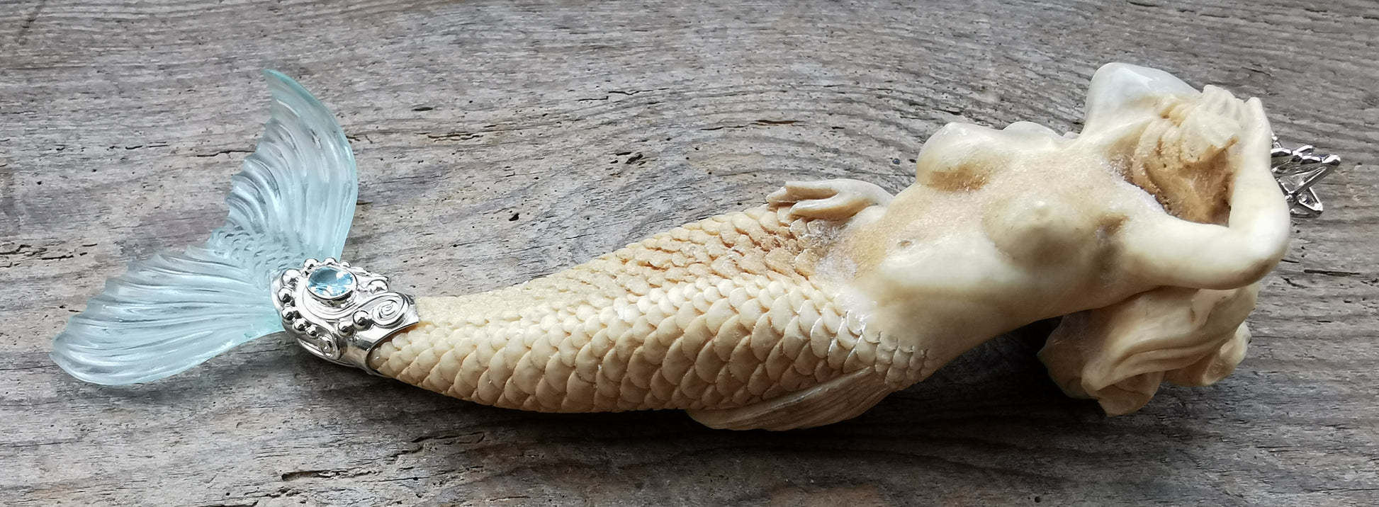 Ref.PD0771 - Silver pendant with Heart Star geometry, ecologically sourced deer horn carved mermaid, and sky blue topaz gemstone.
