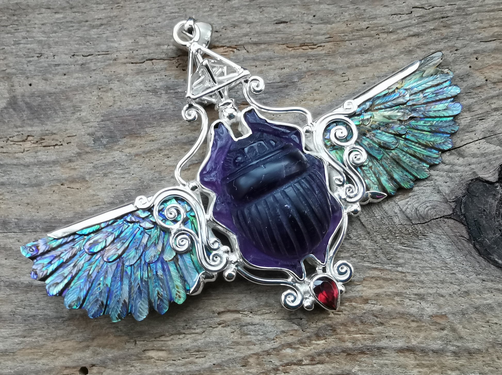 Ref.PD0776 - Silver pendant with Hyper Tetrahedron geometry, abalone carved wings, amethyst carved scarab, and garnet gemstones.
