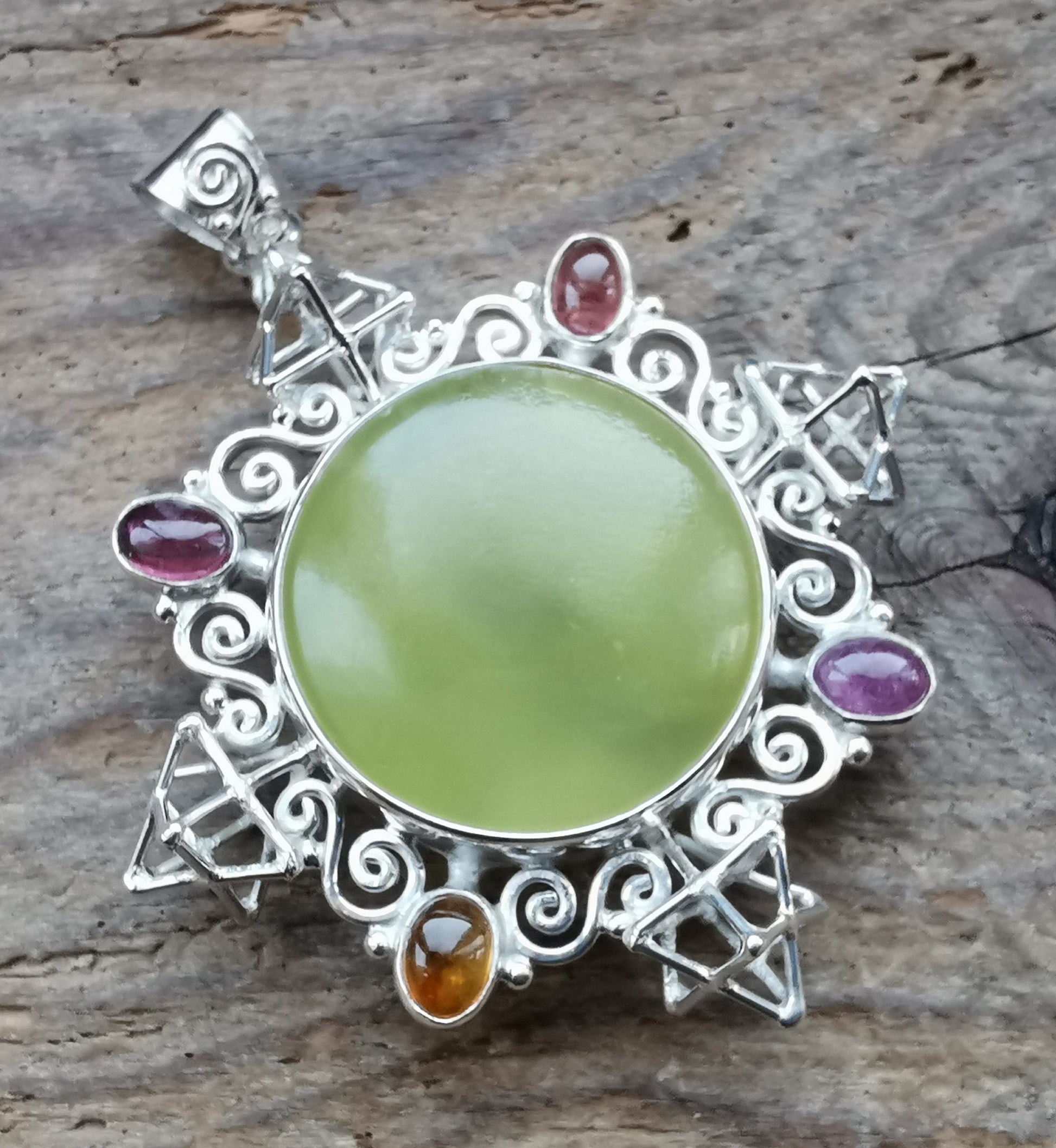 Ref.PD0782 - Silver pendant with Star Tetrahedron geometries in cross, agate, and red/yellow tourmaline gemstones.