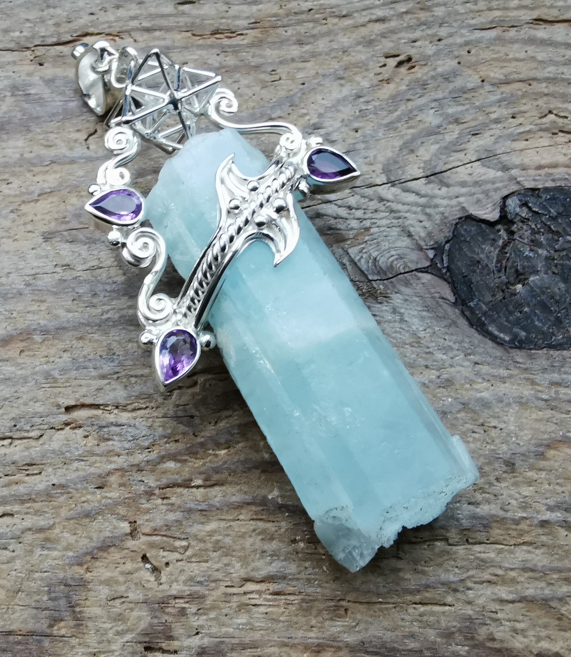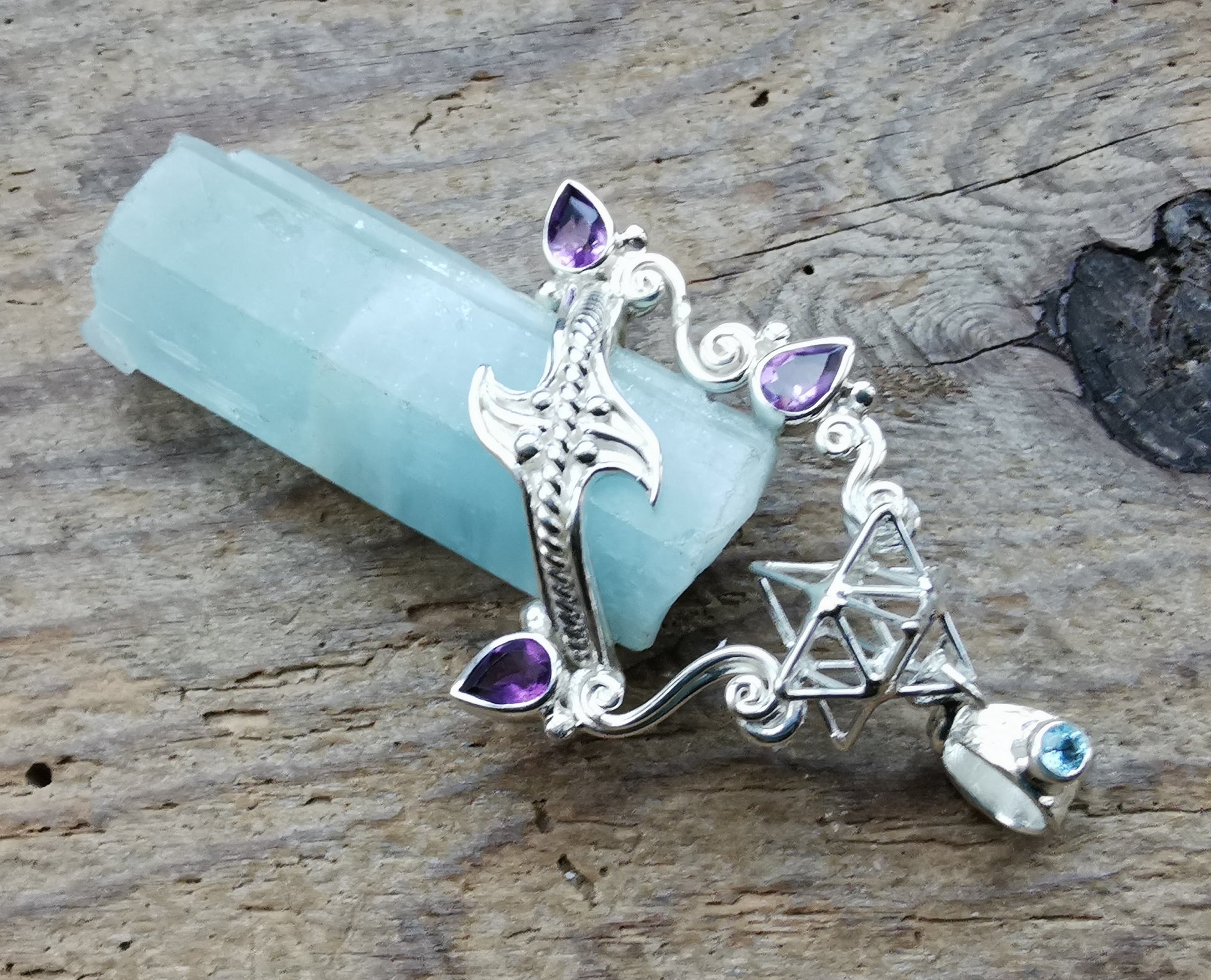 Ref.PD0786 - Silver pendant with Tantric Star geometry, aqua marine amethyst, and sky blue topaz gemstones.