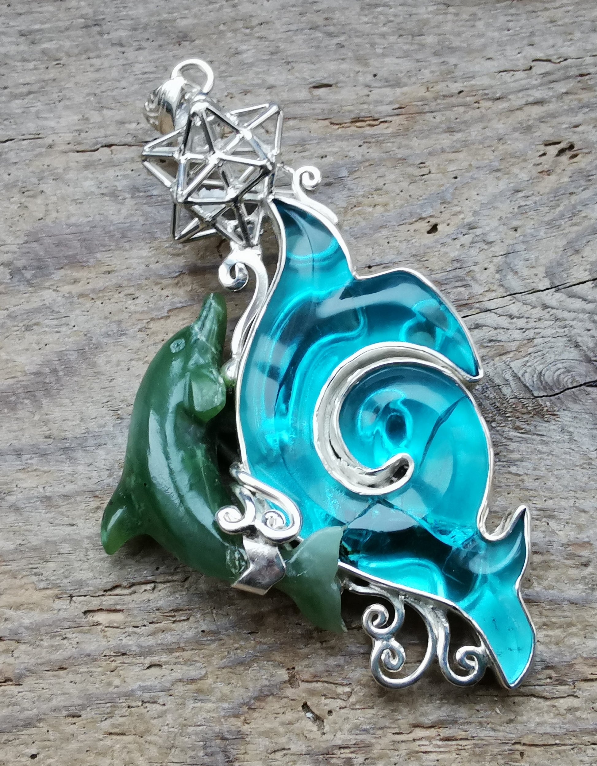 Ref.PD0787 - Silver pendant with Solar Star geometry, jade carved dolphin into wave motif.
