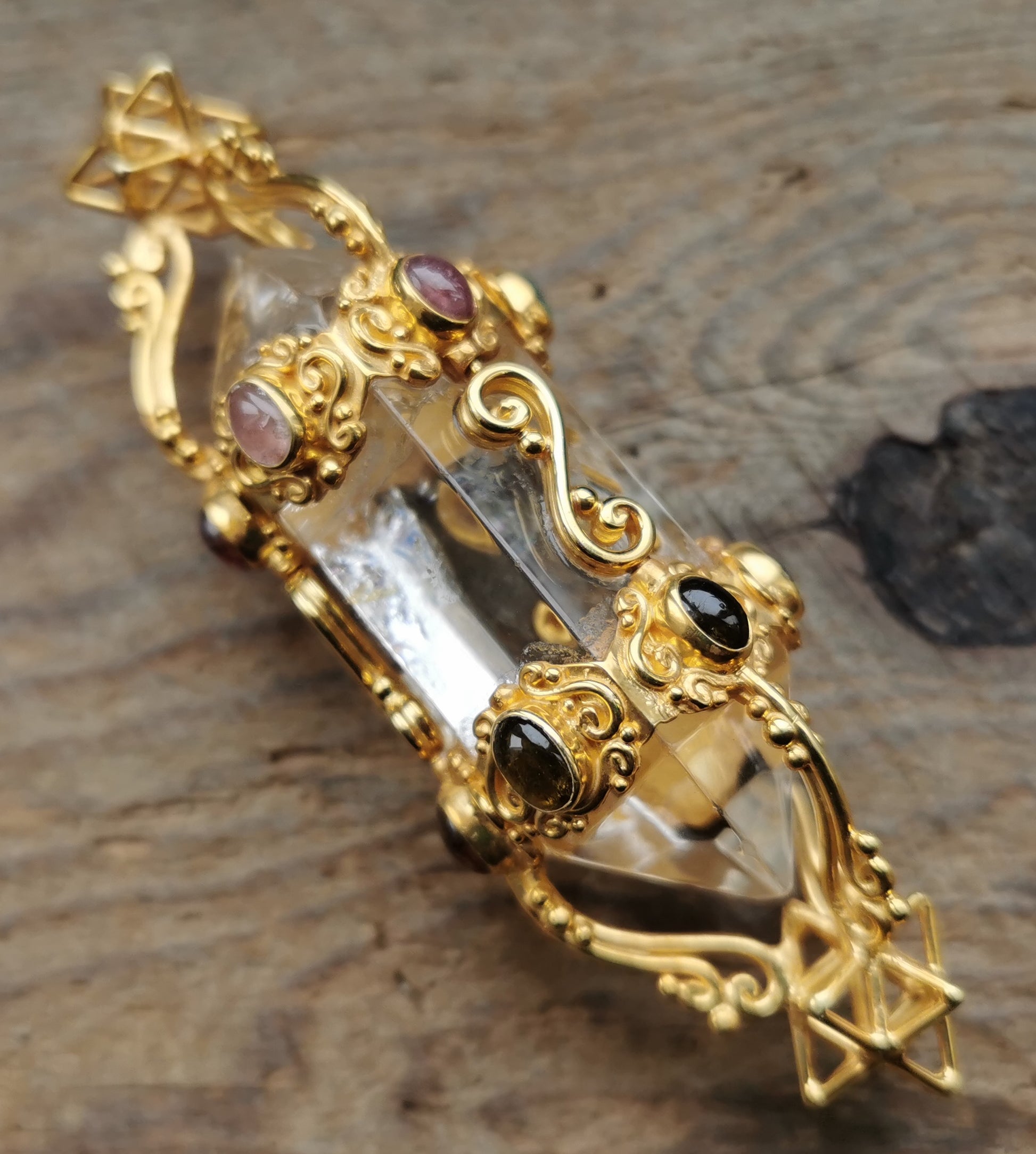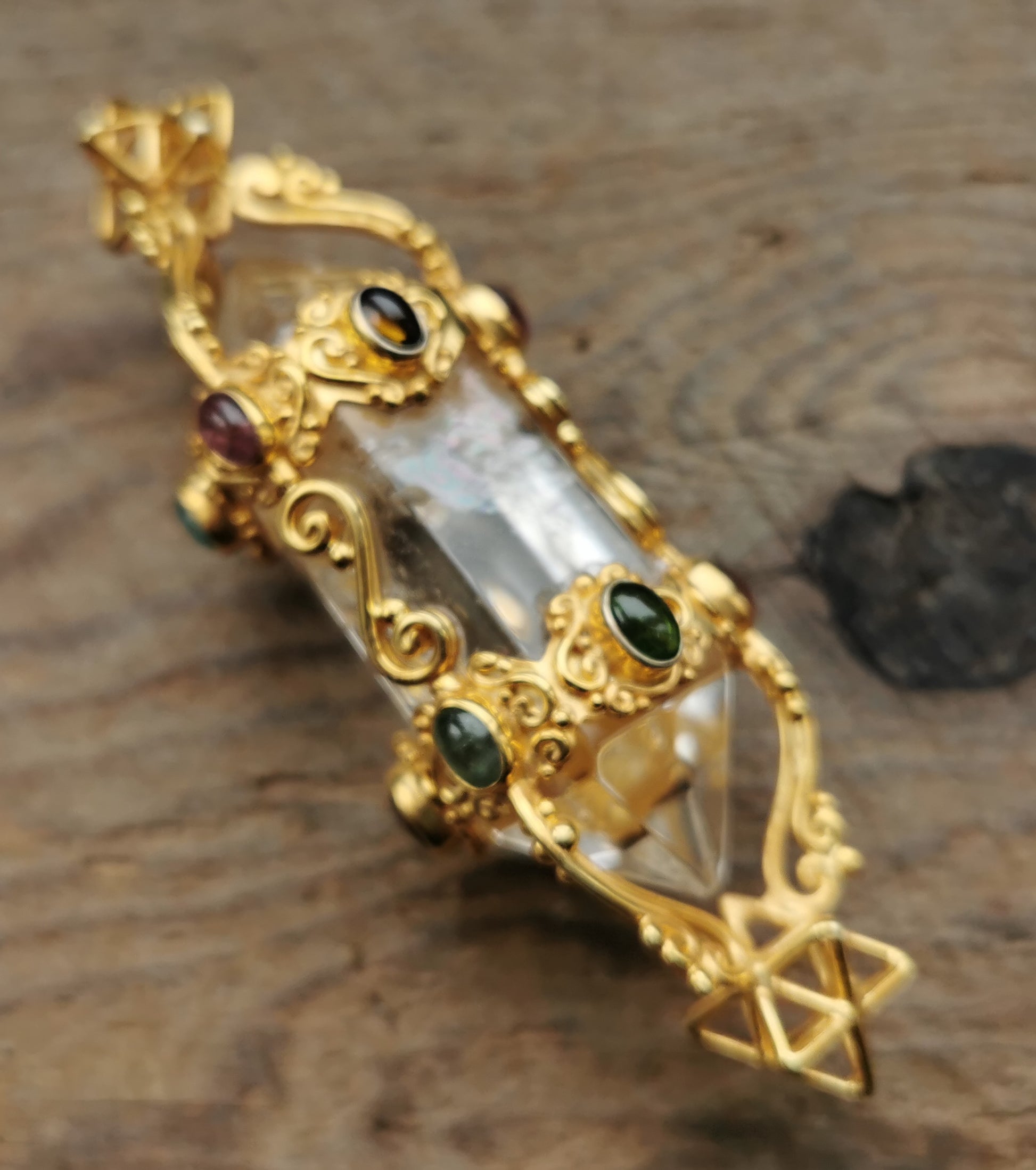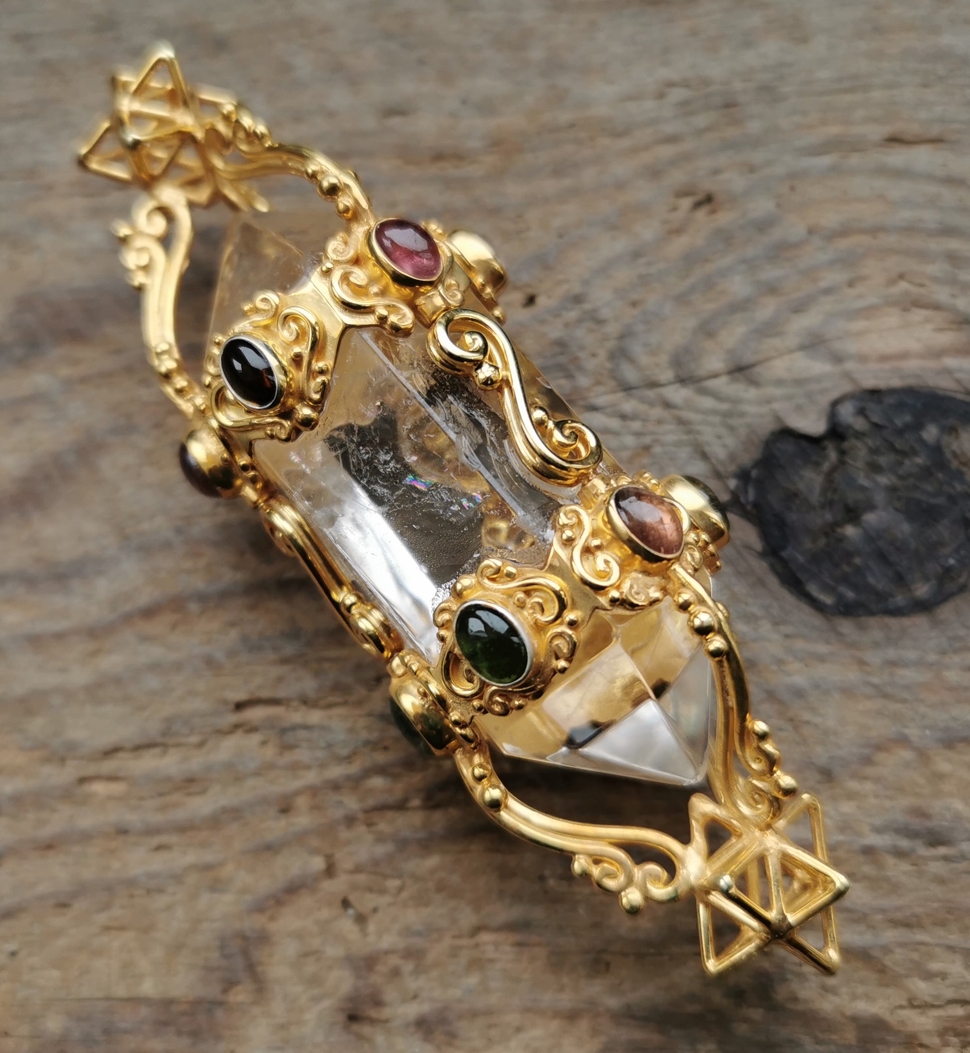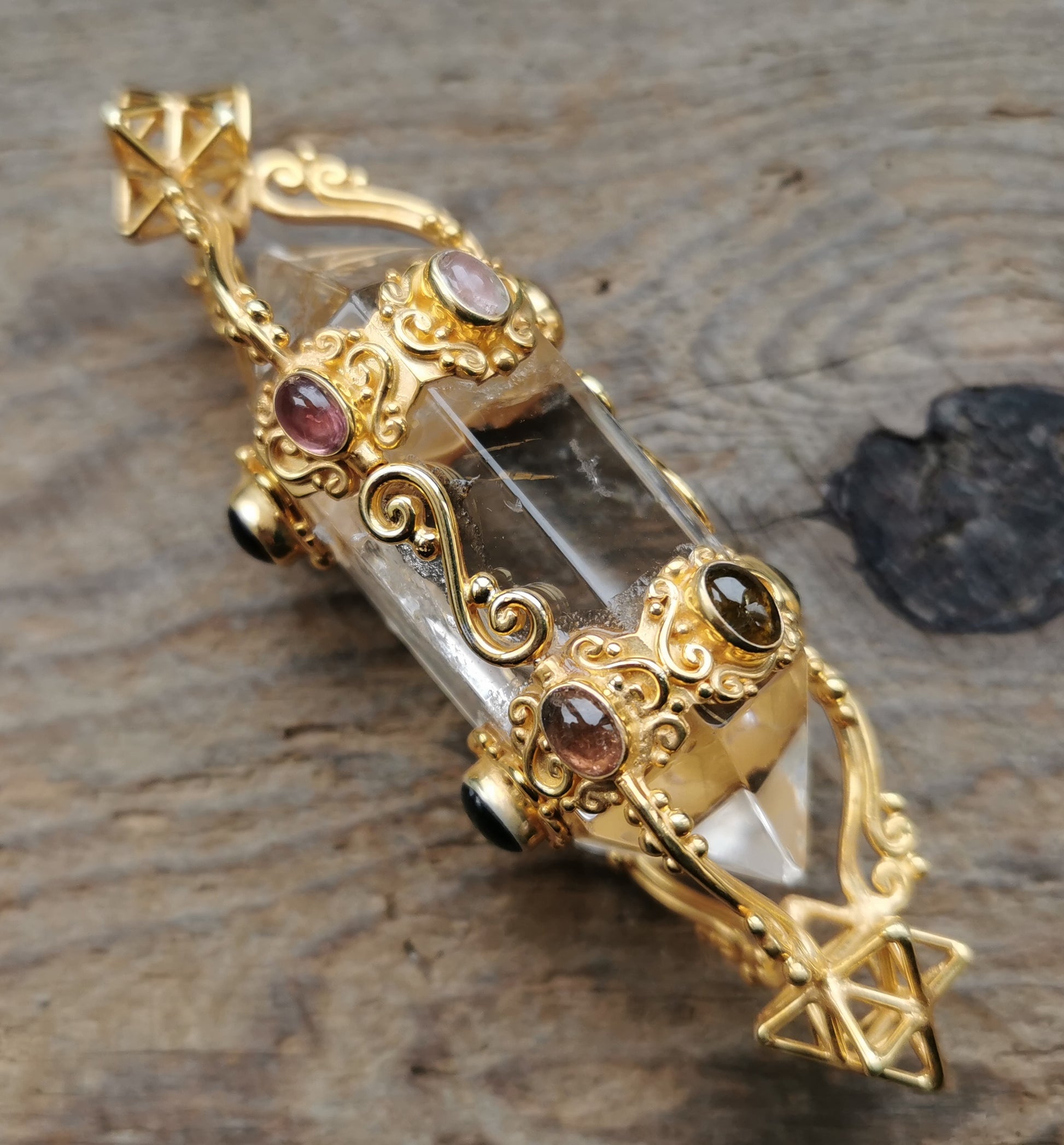 Ref.PD0791 - Gold plated on silver pendant with Tantric Star geometries, double terminated quartz crystal, and tourmaline gemstones.