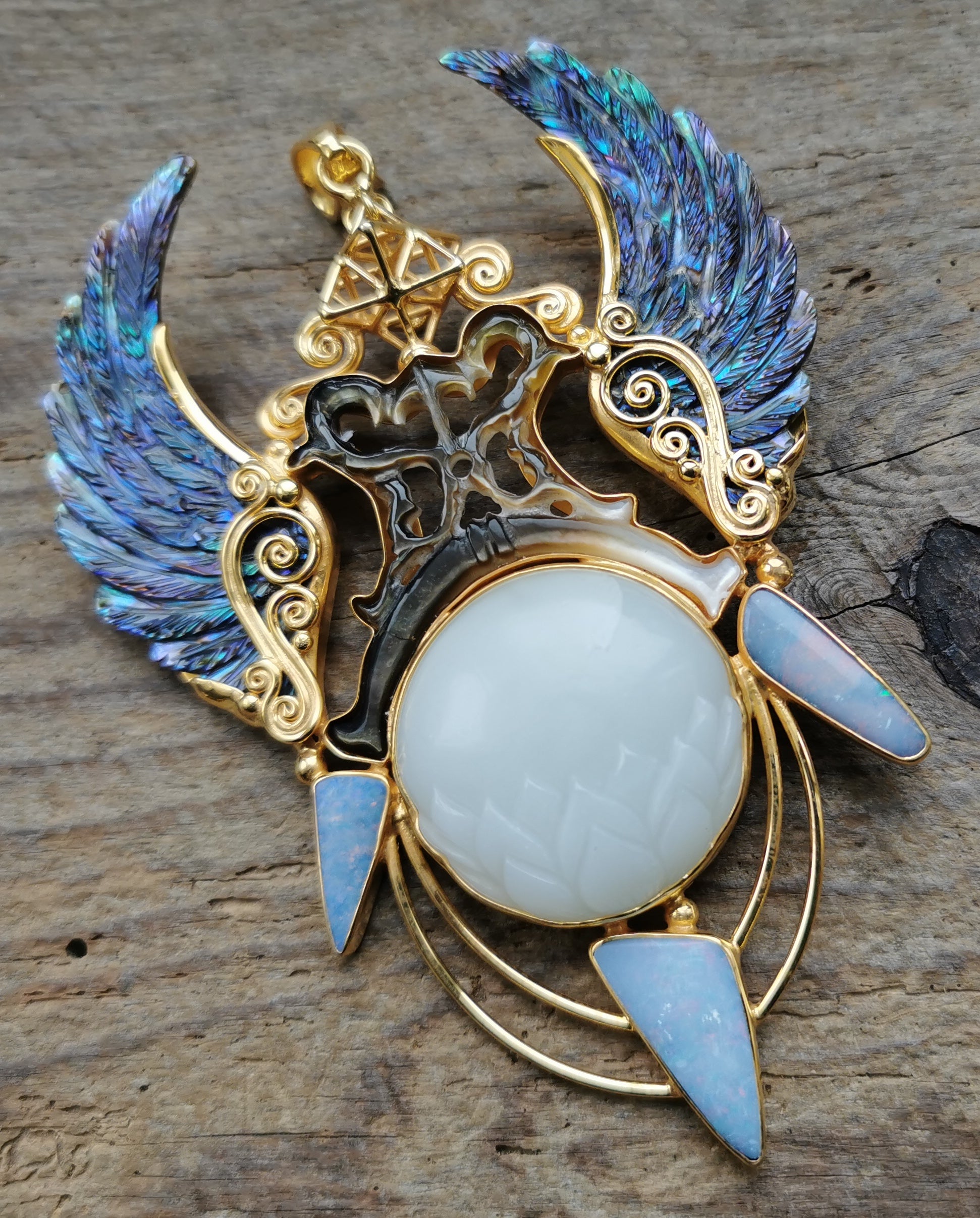 Ref.PD0792 - Gold plated on silver pendant with Tantric Star geometry, abalone carved wings, white jade carved lotus flower, and opals gemstones.