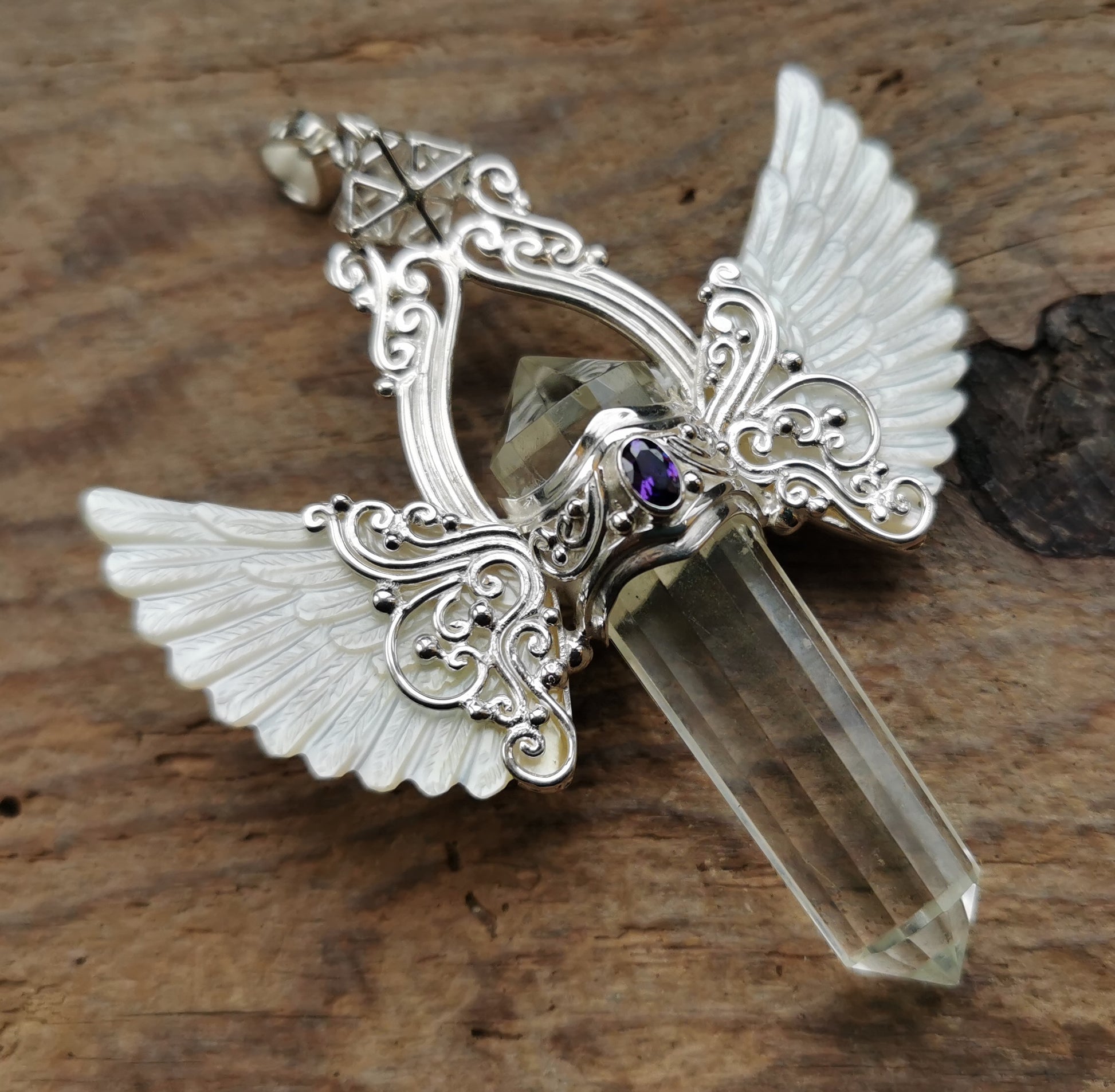Ref.PD0793 - Silver pendant with Tantric Star geometry, mother of pearl carved wings, Vogel quartz crystal, and amethyst gemstone.