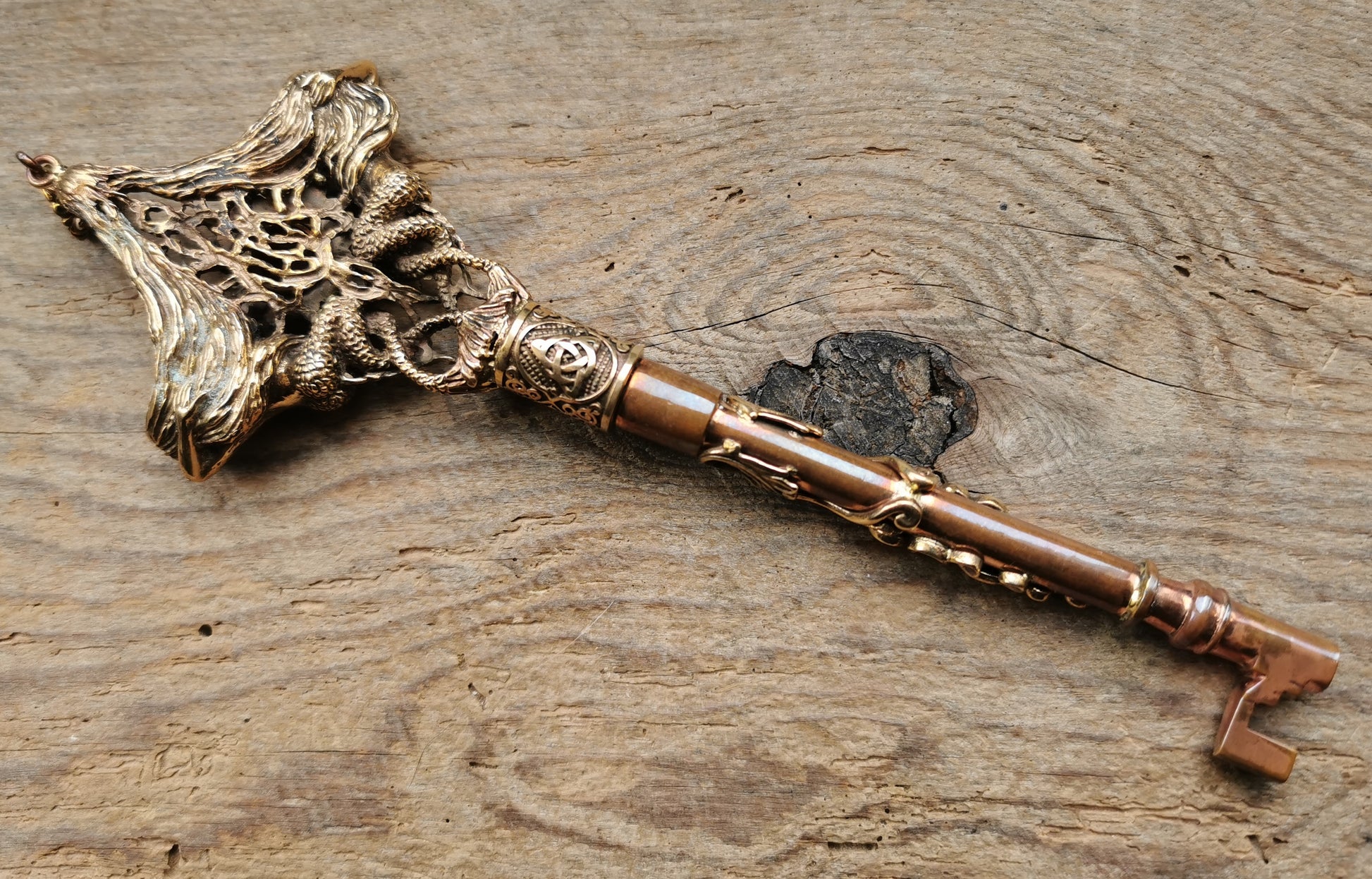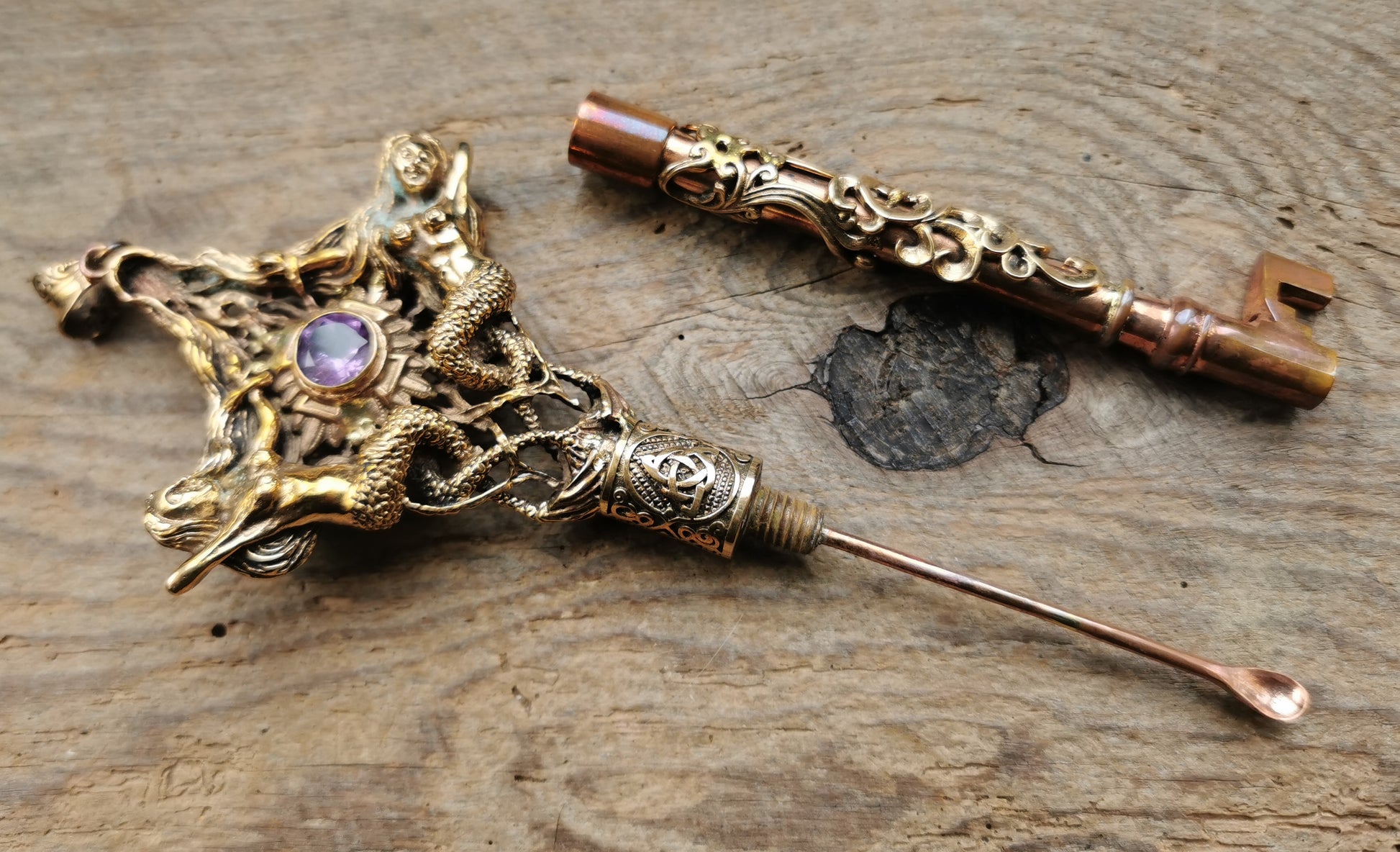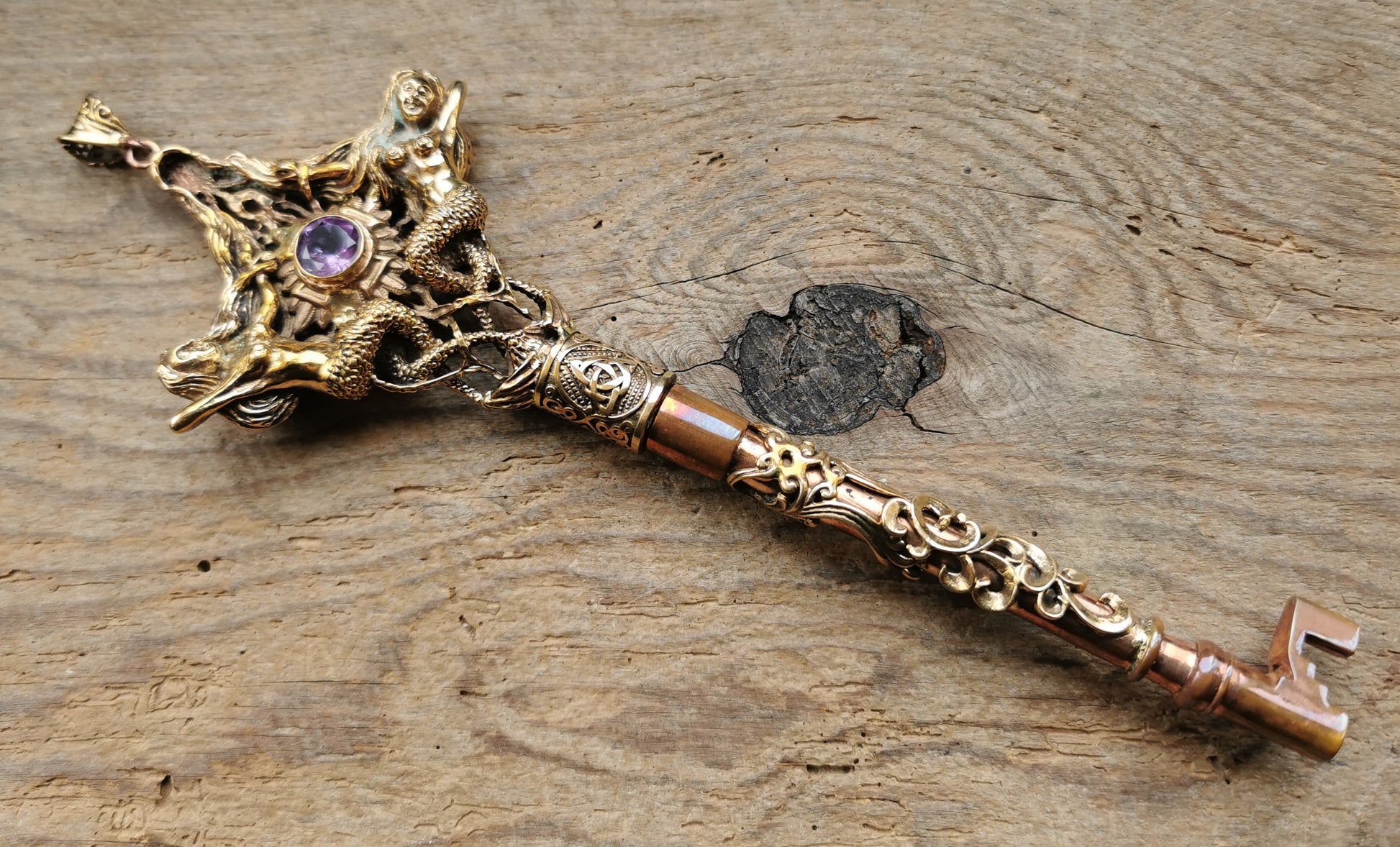 Ref.PD0795 - Brass/copper key pendant with hidden spoon, amethyst gemstone, plus mermaid and Triquetra motifs.