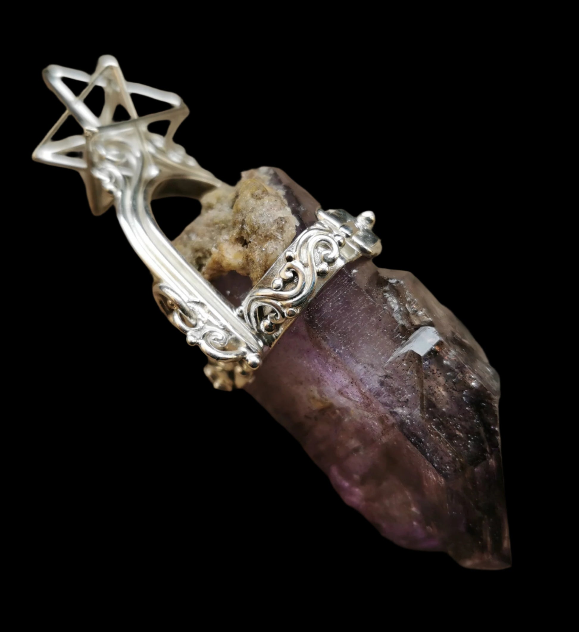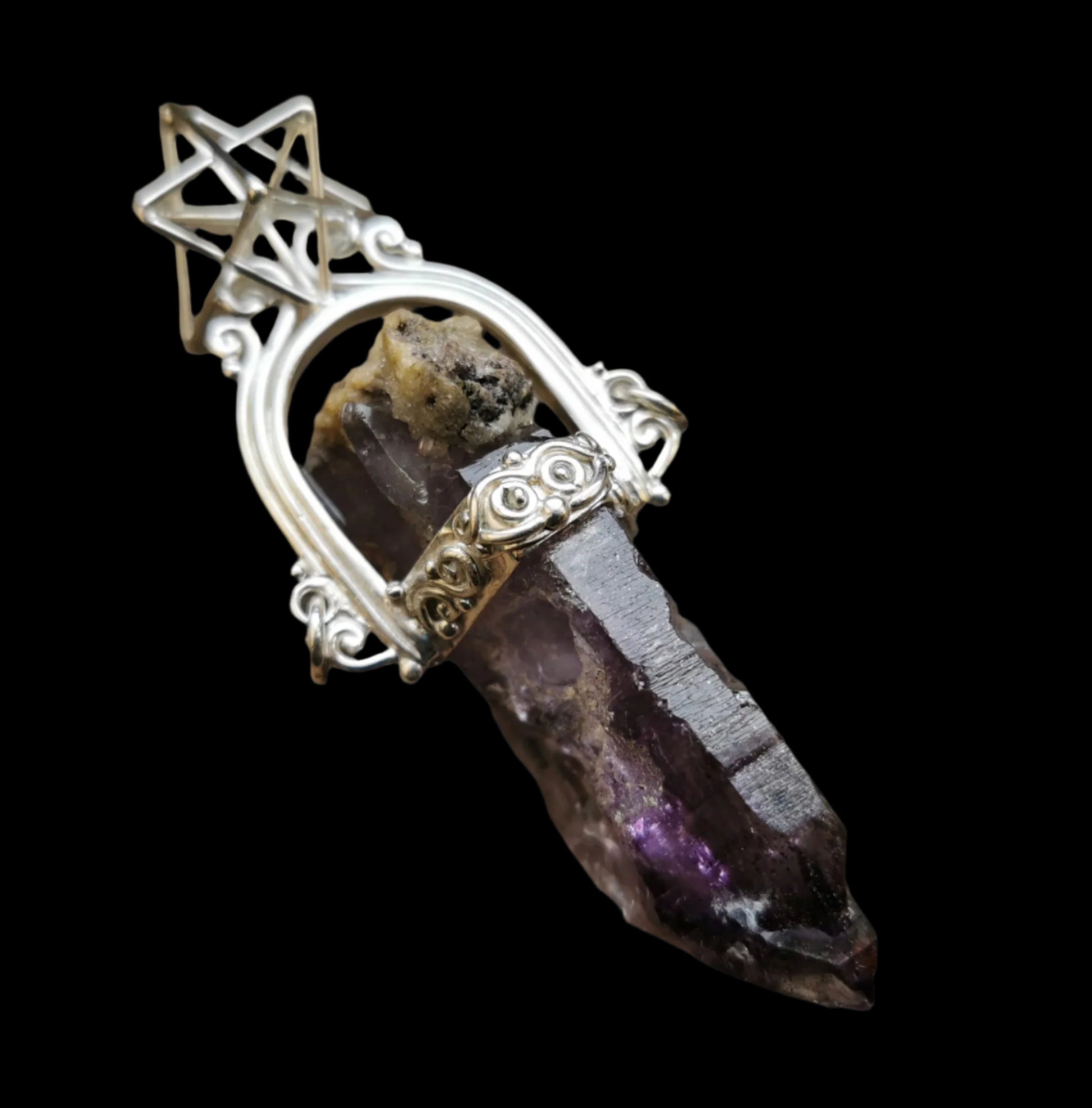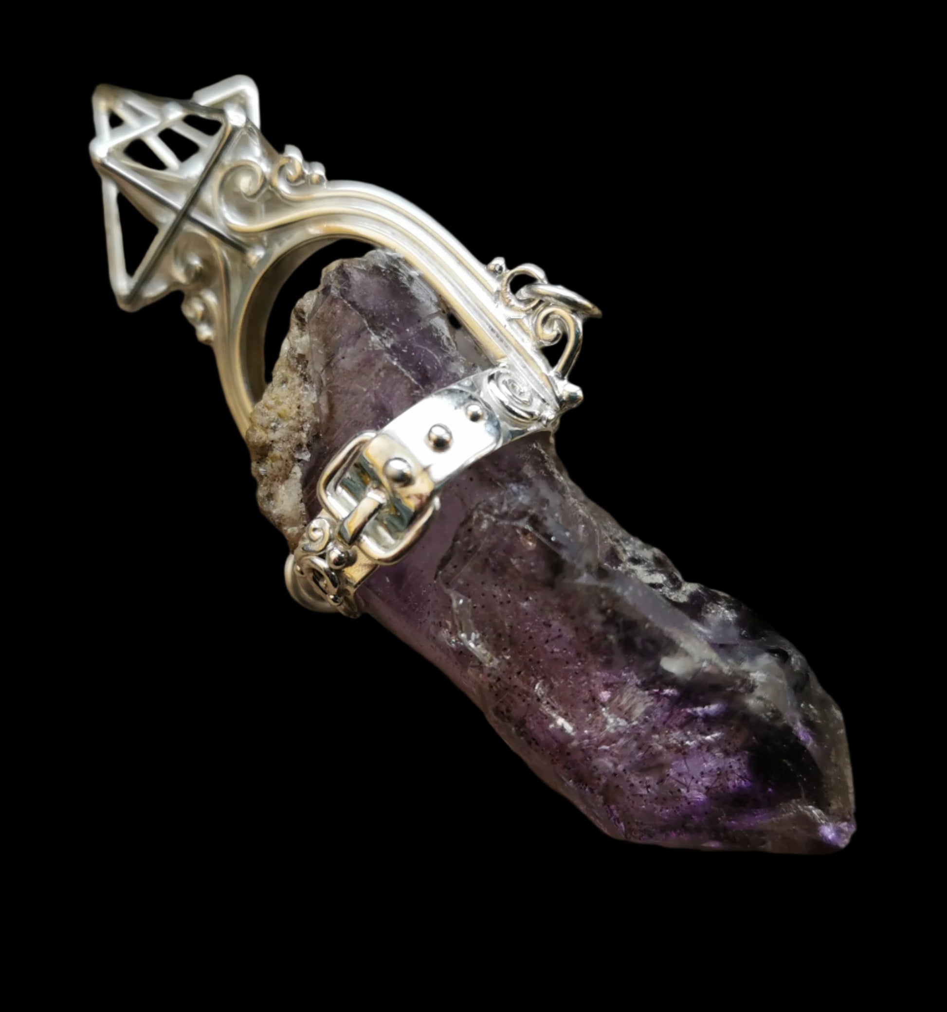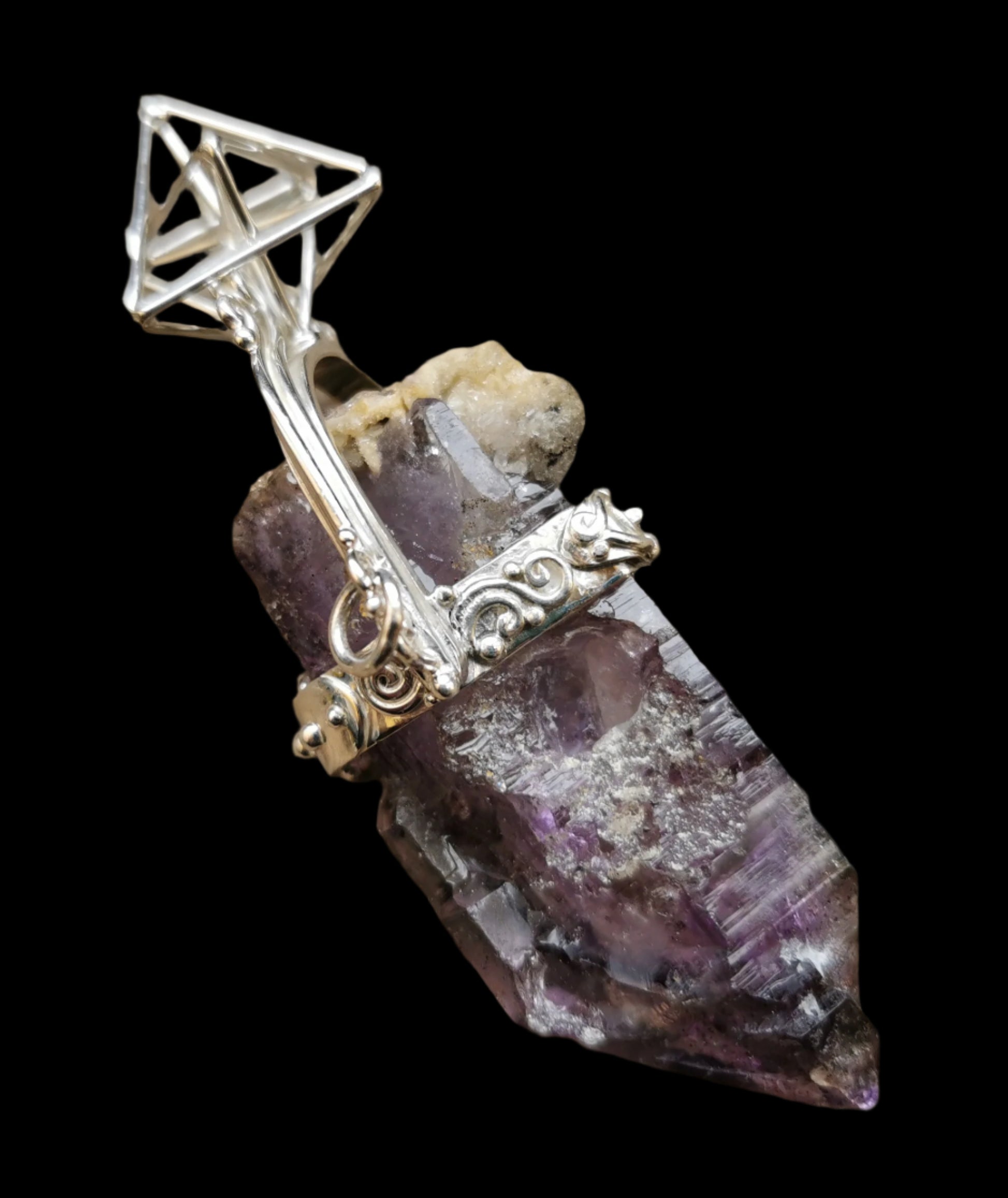 Ref.PD0797 - Silver pendant with Hyper Tetrahedron geometry, and Brandberg amethyst gemstone.
