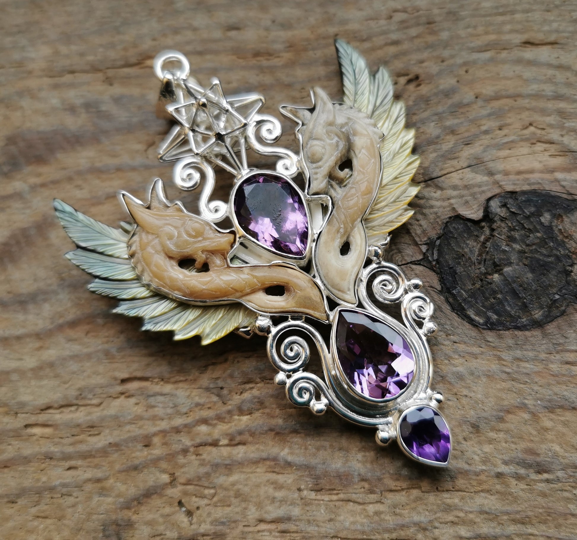 Ref.PD0800 - Silver pendant with Heart Star geometry, mother of pearl carved wings, mastodon ivory carved dragons, and amethyst gems.