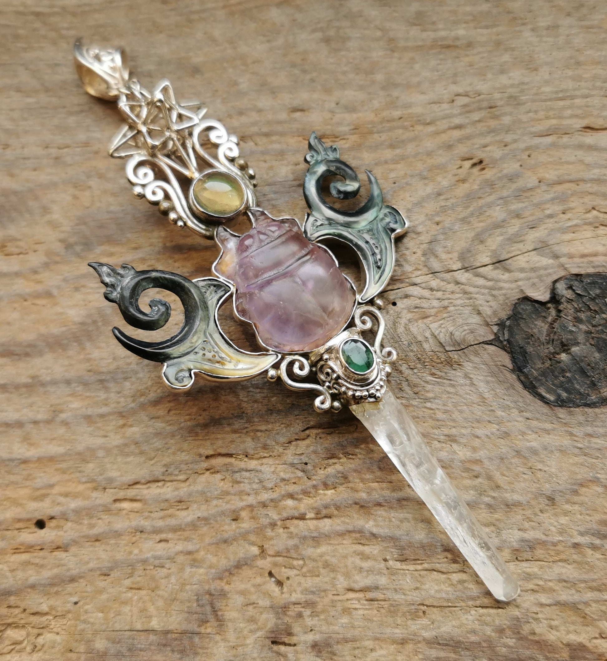 Ref.PD0802 - Silver pendant with Heart Star geometry, laser quartz crystal, amethyst carved scarab, emerald, and opal gemstones. Mother of pearl decoration.