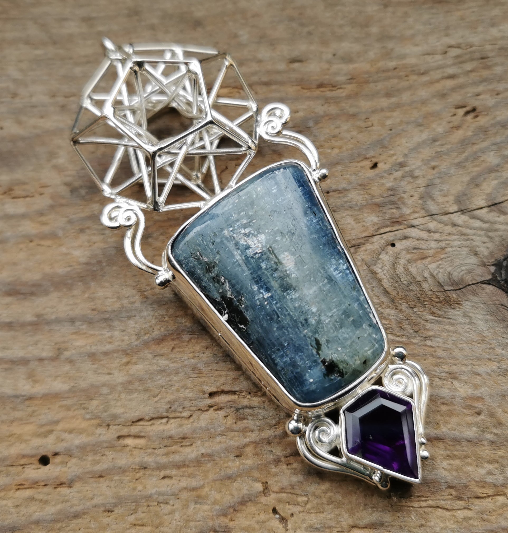 Ref.PD0803 - Silver pendant with 5D Hyper Dodecahedron geometry, kyanite, and amethyst gemstones.