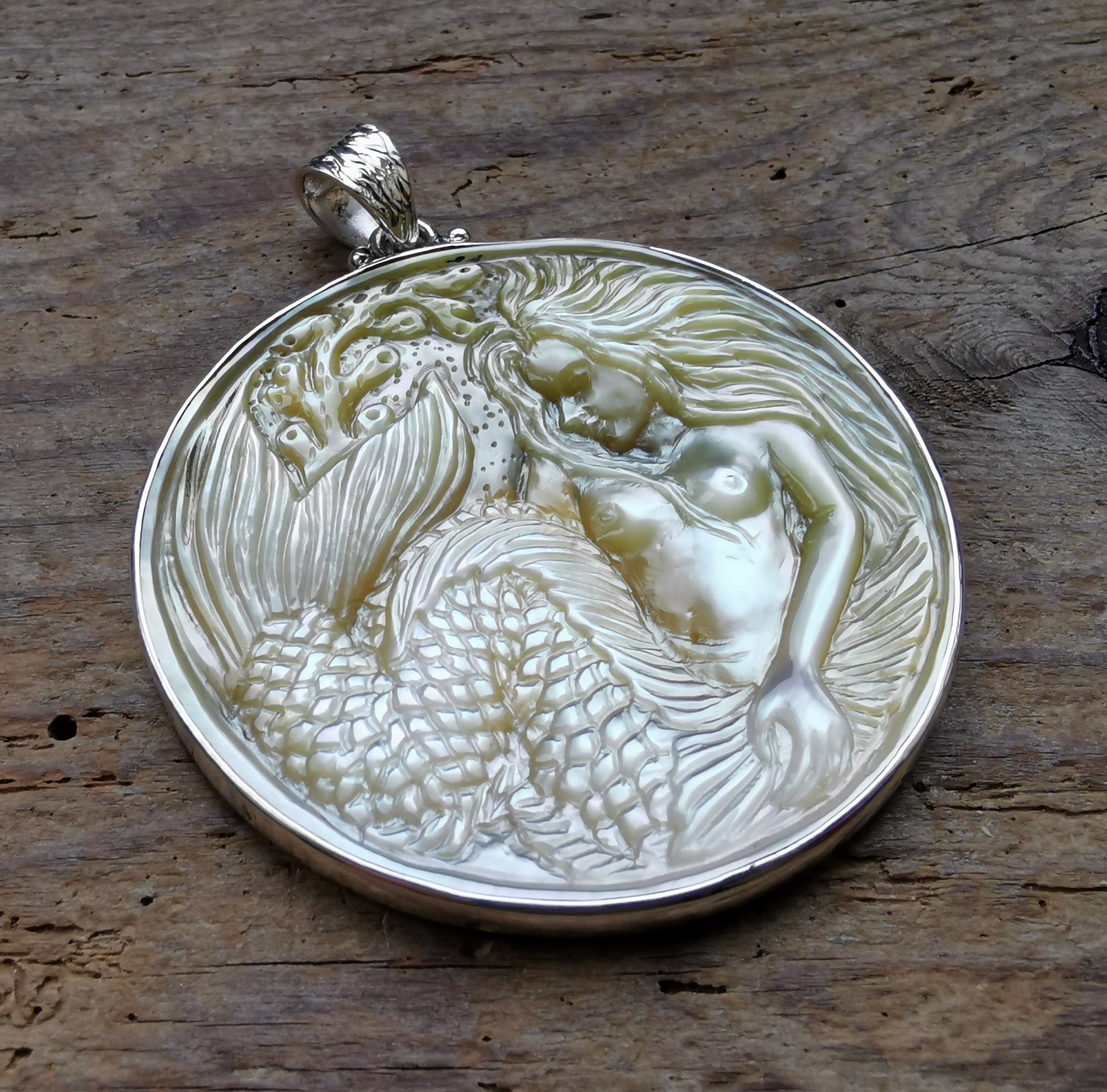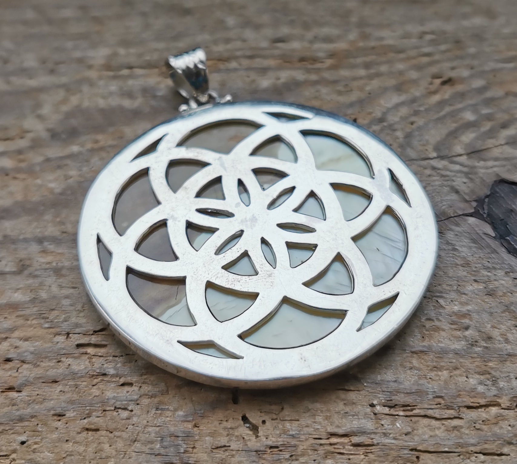 Ref.PD0804- Double sided pendant with silver Solar Mandala geometry and mermaid carved in mother of pearl.