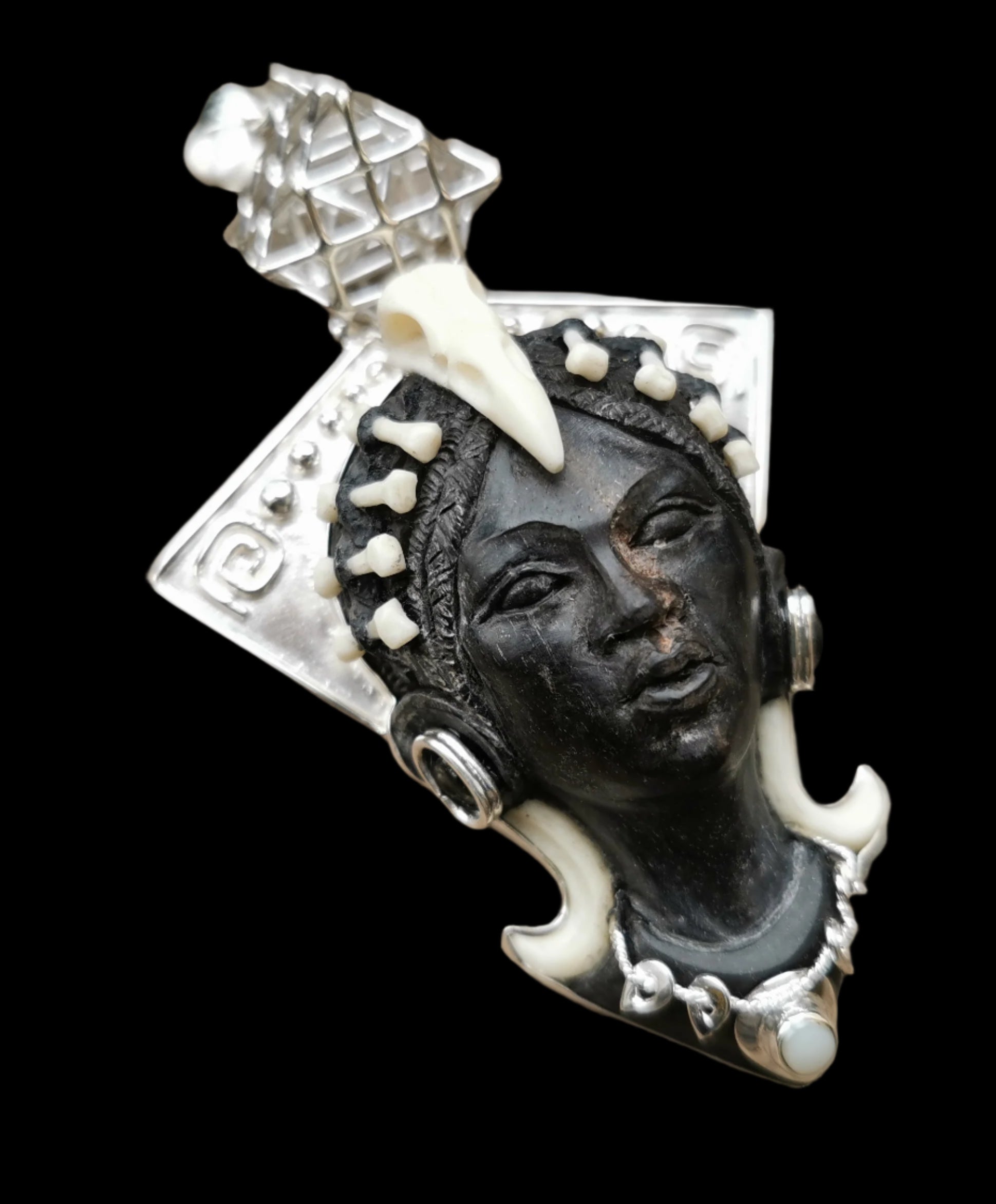Ref.PD0813 - Silver pendant with Tantric Terra Prana geometry, iron wood carved shaman, ecologically sourced deer horn carved raven skull & bones, and opal gemstone.
