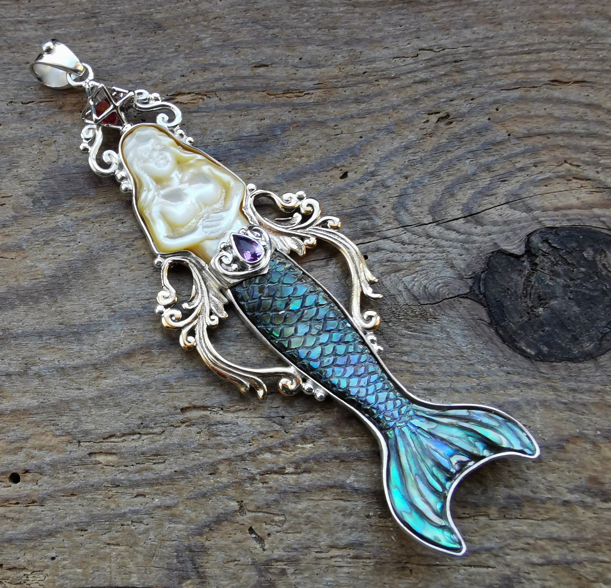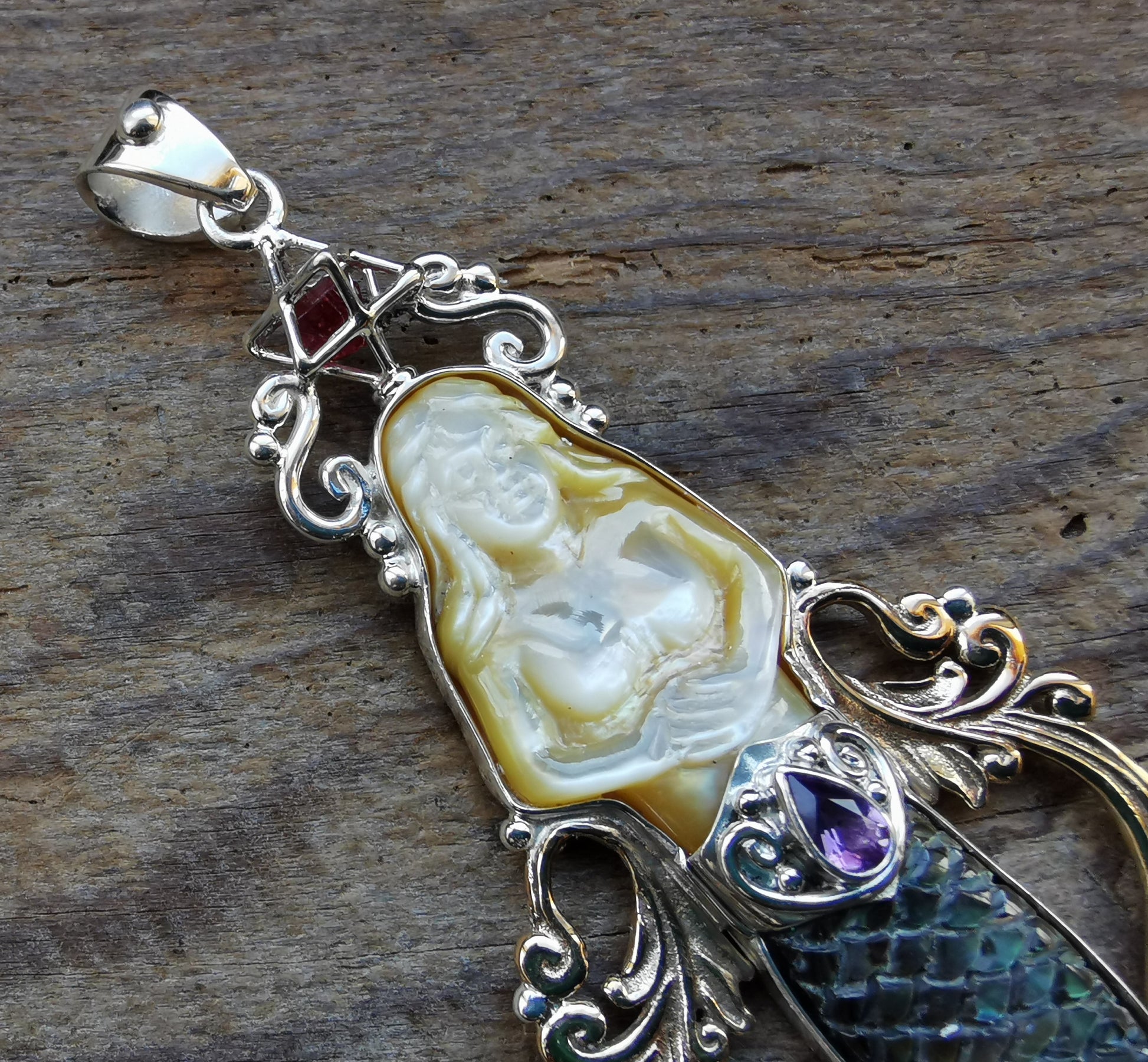 Ref.PD0817 - Silver/brass pendant with Star Tetrahedron geometry, mother of pearl/abalone carved mermaid, amethyst, and ruby gemstone.